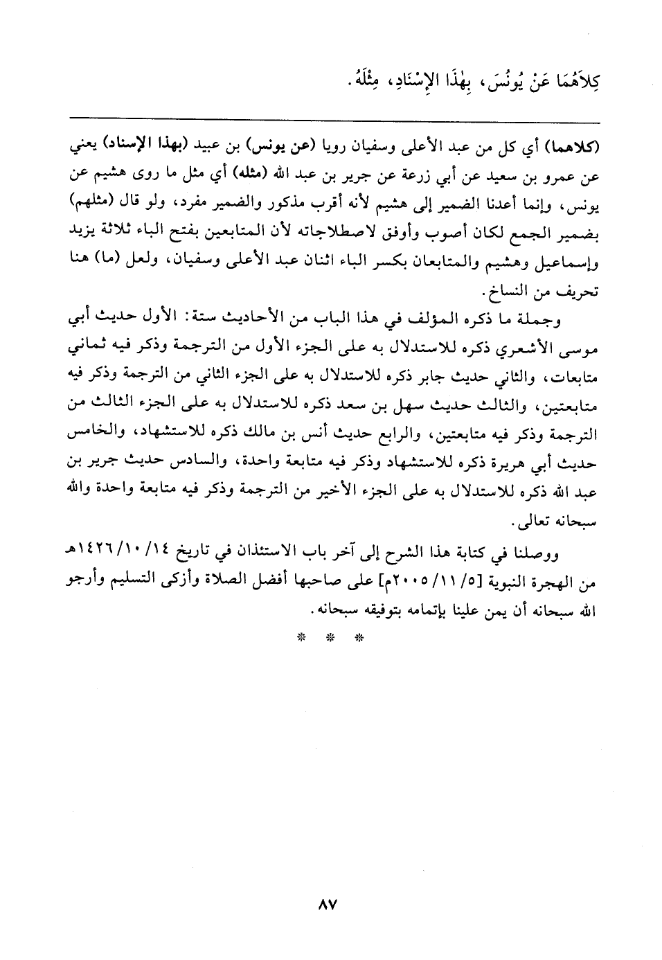 ووصلنا في كتابة هذا الشرح إلى آخر باب الاستئذان في تاريخ ١٤/ ١٠ / ٤٢٦ اهـ من الهجرة النبوية [٥/ ١١ / ٢٠٠٥ م] على صاحبها أفضل الصلاة وأزكى التسليم وأرجو الله سبحانه أن يمن علينا بإتمامه بتوفيقه سبحانه.
