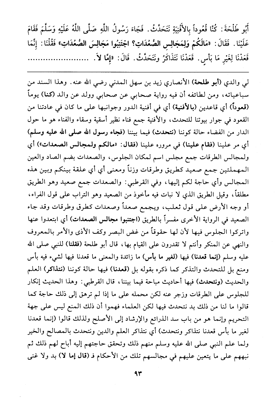 أَبُو طَلْحَةَ: كُنَّا قُعُودًا بِالأَفْنِيَةِ نَتَحَدَّثُ. فَجَاءَ رَسُولُ اللهِ صلى الله عليه وسلم فَقَامَ عَلَينَا. فَقَال: "مَا لَكُمْ وَلِمَجَالِسِ الصُّعُدَاتِ؟ اجْتَنِبُوا مَجَالِسَ الصُّعُدَاتِ" فَقُلْنَا: إِنَّمَا قَعَدْنَا لِغَيرِ مَا بَأسٍ. قَعَدْنَا نَتَذَاكَرُ وَنَتَحَدَّثُ. قَال: "إِمَّا لا