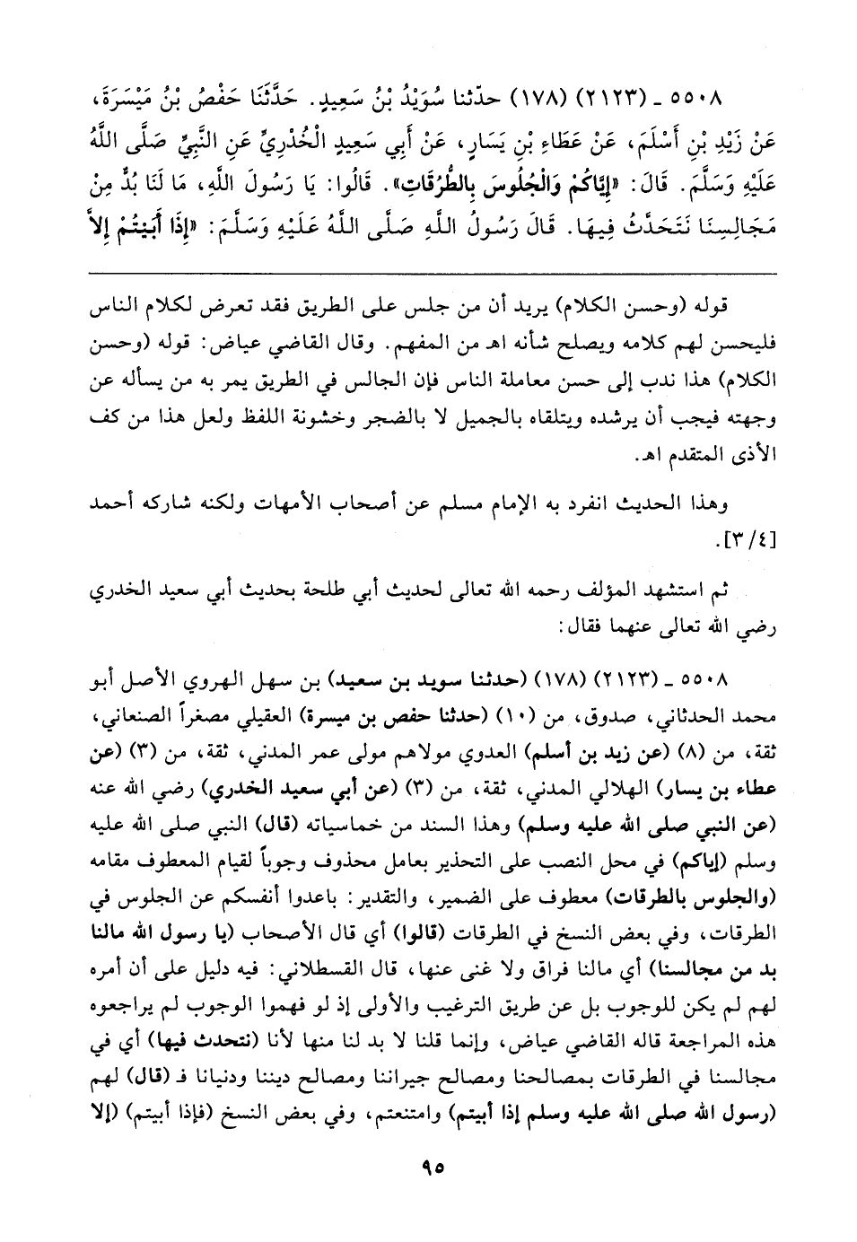 ٥٥٠٨ - (٢١٢٣) (١٧٨) حَدَّثَنَا سُوَيدُ بْنُ سَعِيدٍ. حَدَّثَنَا حَفْصُ بْنُ مَيسَرَةَ، عَنْ زَيدِ بْنِ أَسْلَمَ، عَنْ عَطَاءِ بْنِ يَسَارٍ, عَنْ أَبِي سَعِيدٍ الْخُدْرِيِّ عَنِ النَّبِيِّ صلى الله عليه وسلم. قَال: "إِيَّاكُمْ وَالْجُلُوسَ بِالطُّرُقَاتِ". قَالُوا: يَا رَسُولَ اللهِ, مَا لَنَا بُدٌّ مِنْ مَجَالِسِنَا نَتَحَدَّثُ فِيهَا. قَال رَسُولُ اللهِ صلى الله عليه وسلم: "إِذَا أَبَيتُمْ إِلَّا