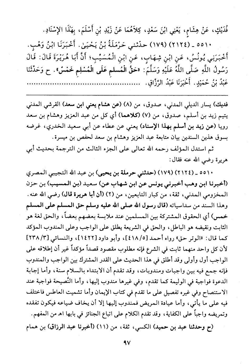 ٥٥١٠ - (٢١٢٤) (١٧٩) حَدَّثَنِي حَرْمَلَةُ بْنُ يَحْيَى. أَخْبَرَنَا ابْنُ وَهْبٍ. أَخْبَرَنِي يُونُسُ، عَنِ ابْنِ شِهَابٍ، عَنِ ابْنِ الْمُسَيَّبِ؛ أَنَّ أَبَا هُرَيرَةَ قَال: قَال رَسُولُ اللهِ صلى الله عليه وسلم: "حَقُّ الْمُسْلِمِ عَلَى الْمُسْلِمِ خَمْسٌ".ح وَحَدَّثَنَا عَبْدُ بْنُ حُمَيدٍ. أَخْبَرَنَا عَبْدُ الرَّزَّاقِ