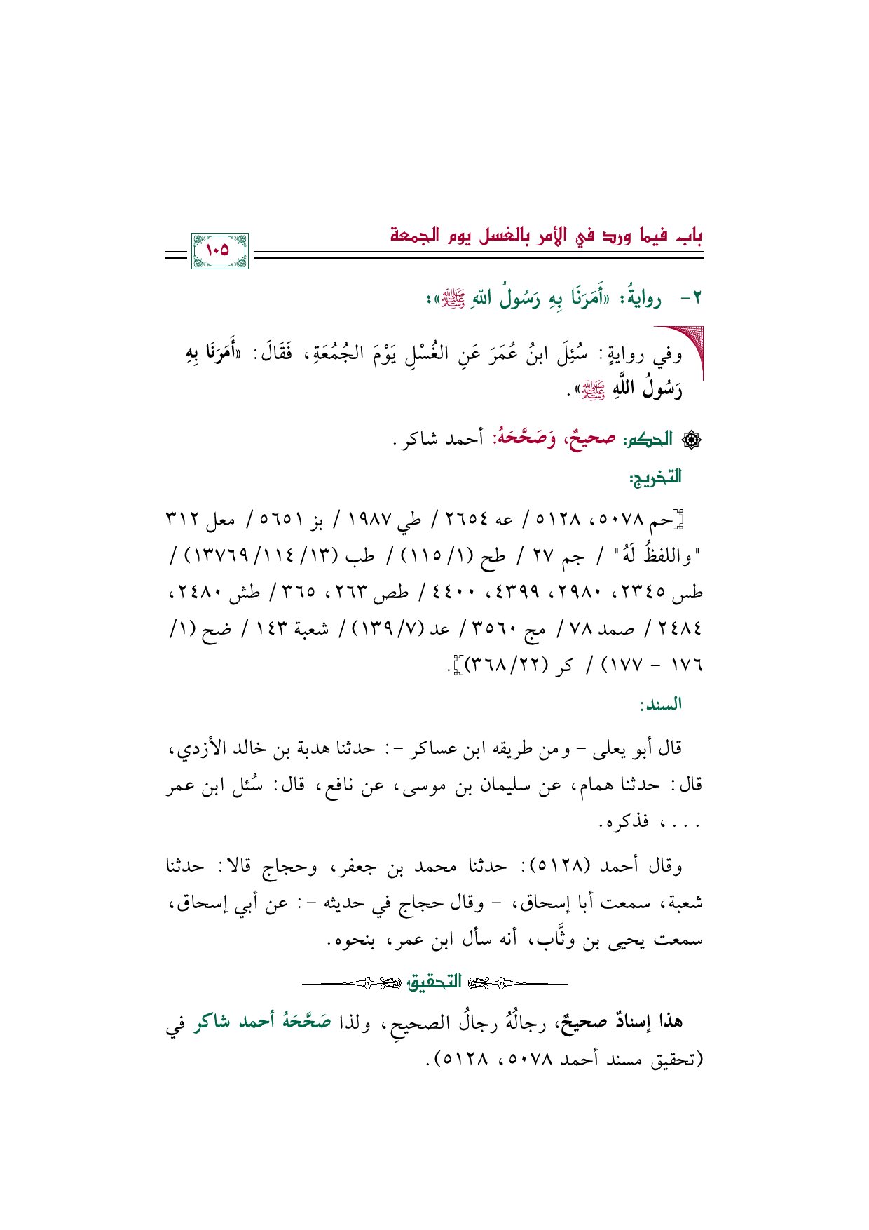 • وفي روايةٍ: سُئِلَ ابنُ عُمَرَ عَنِ الغُسْلِ يَوْمَ الجُمُعَةِ، فَقَالَ: ((أَمَرَنَا بِهِ رَسُولُ اللَّهِ صلى الله عليه وسلم)).