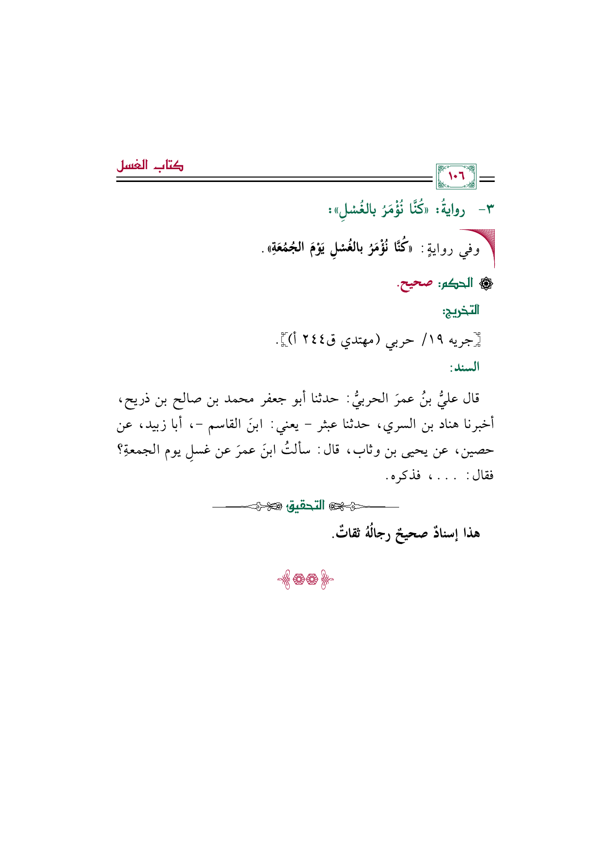 قال عليُّ بنُ عمرَ الحربيُّ: حدثنا أبو جعفر محمد بن صالح بن ذريح، أخبرنا هناد بن السري، حدثنا عبثر -يعني: ابنَ القاسم-، أبا زبيد، عن حصين، عن يحيى بن وثاب، قال: سألتُ ابنَ عمرَ عن غسلِ يوم الجمعةِ؟ فقال: ... ، فذكره.