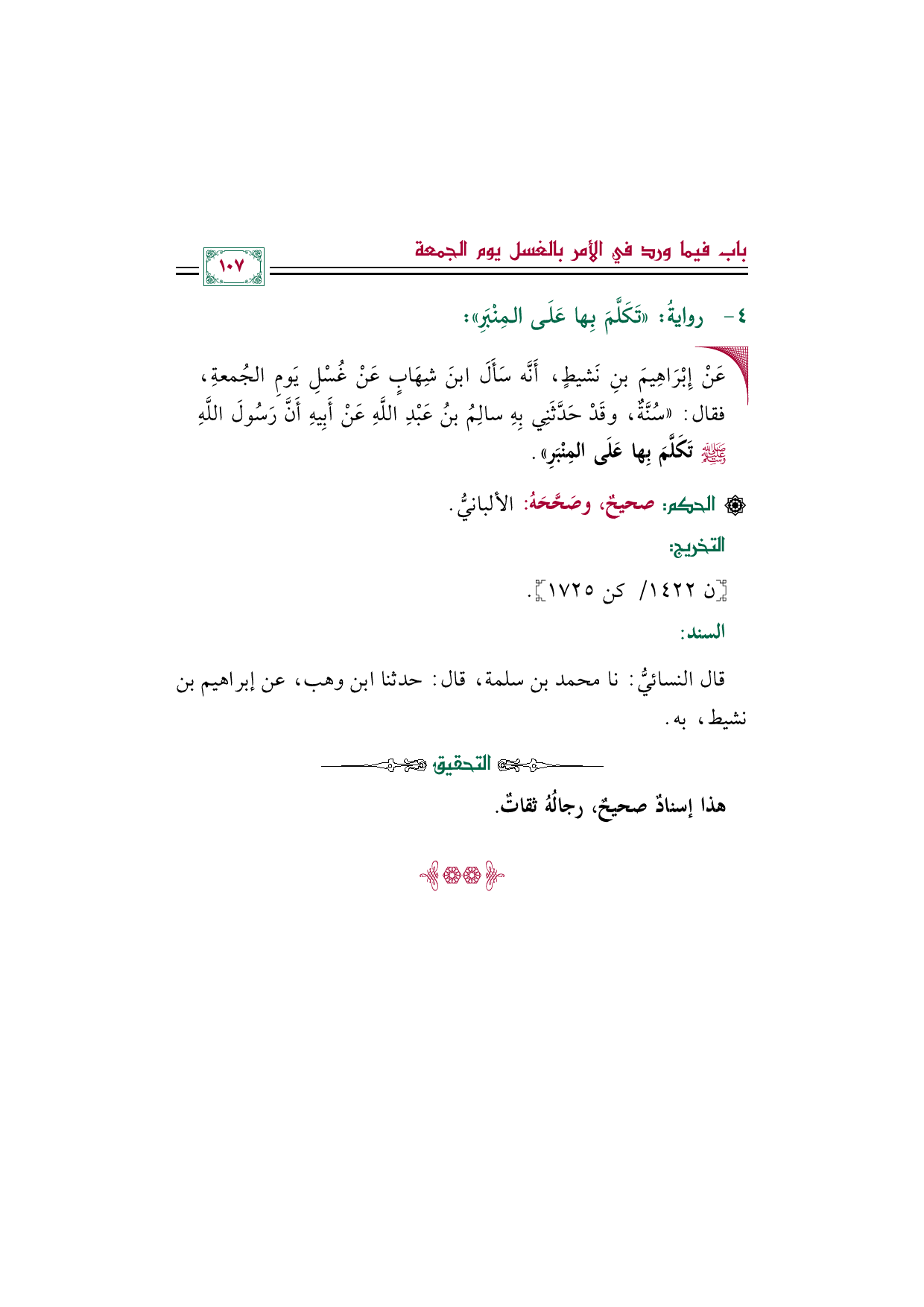 • عَنْ إِبْرَاهِيمَ بنِ نَشيطٍ، أَنَّه سَأَلَ ابنَ شِهَابٍ عَنْ غُسْلِ يَومِ الجُمعةِ، فقال: ((سُنَّةٌ، وقَدْ حَدَّثَنِي بِهِ سالِمُ بنُ عَبْدِ اللَّهِ عَنْ أَبِيهِ أَنَّ رَسُولَ اللَّهِ صلى الله عليه وسلم تَكَلَّمَ بِها عَلَى المِنْبَرِ)).