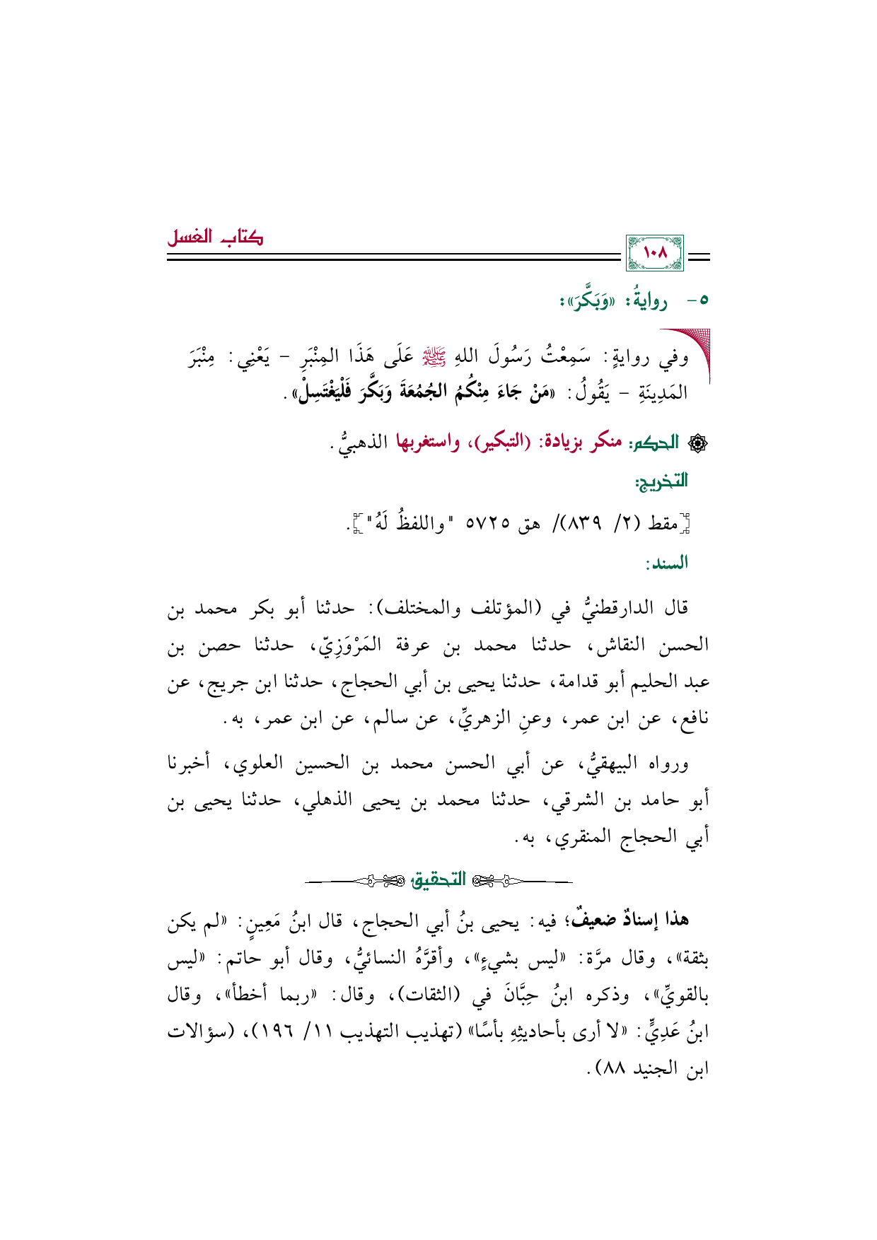 • وفي روايةٍ: سَمِعْتُ رَسُولَ اللهِ صلى الله عليه وسلم عَلَى هَذَا المِنْبَرِ -يَعْنِي: مِنْبَرَ المَدِينَةِ- يَقُولُ: ((مَنْ جَاءَ مِنْكُمُ الجُمُعَةَ وَبَكَّرَ فَلْيَغْتَسِلْ)).
