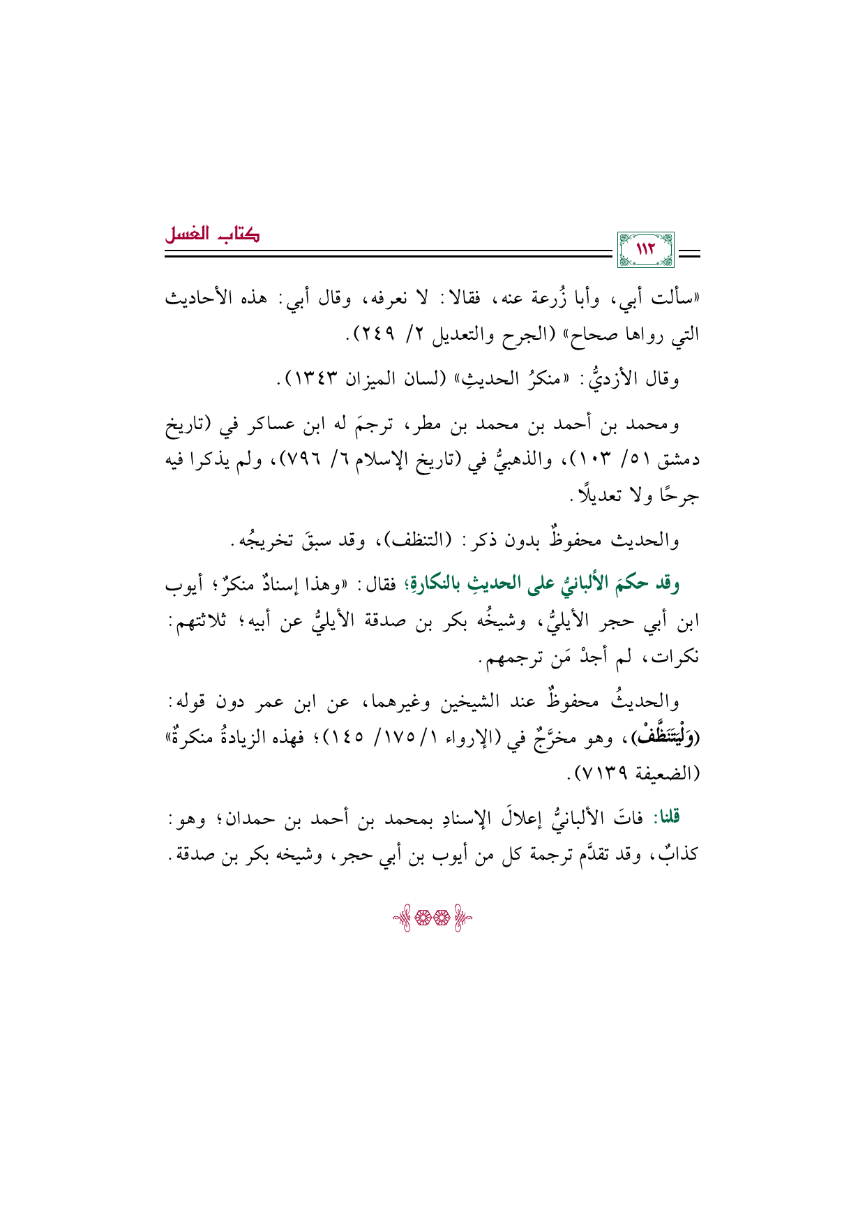 قلنا: فاتَ الألبانيُّ إعلالَ الإسنادِ بمحمد بن أحمد بن حمدان؛ وهو: كذابٌ، وقد تقدَّم ترجمة كل من أيوب بن أبي حجر، وشيخه بكر بن صدقة.