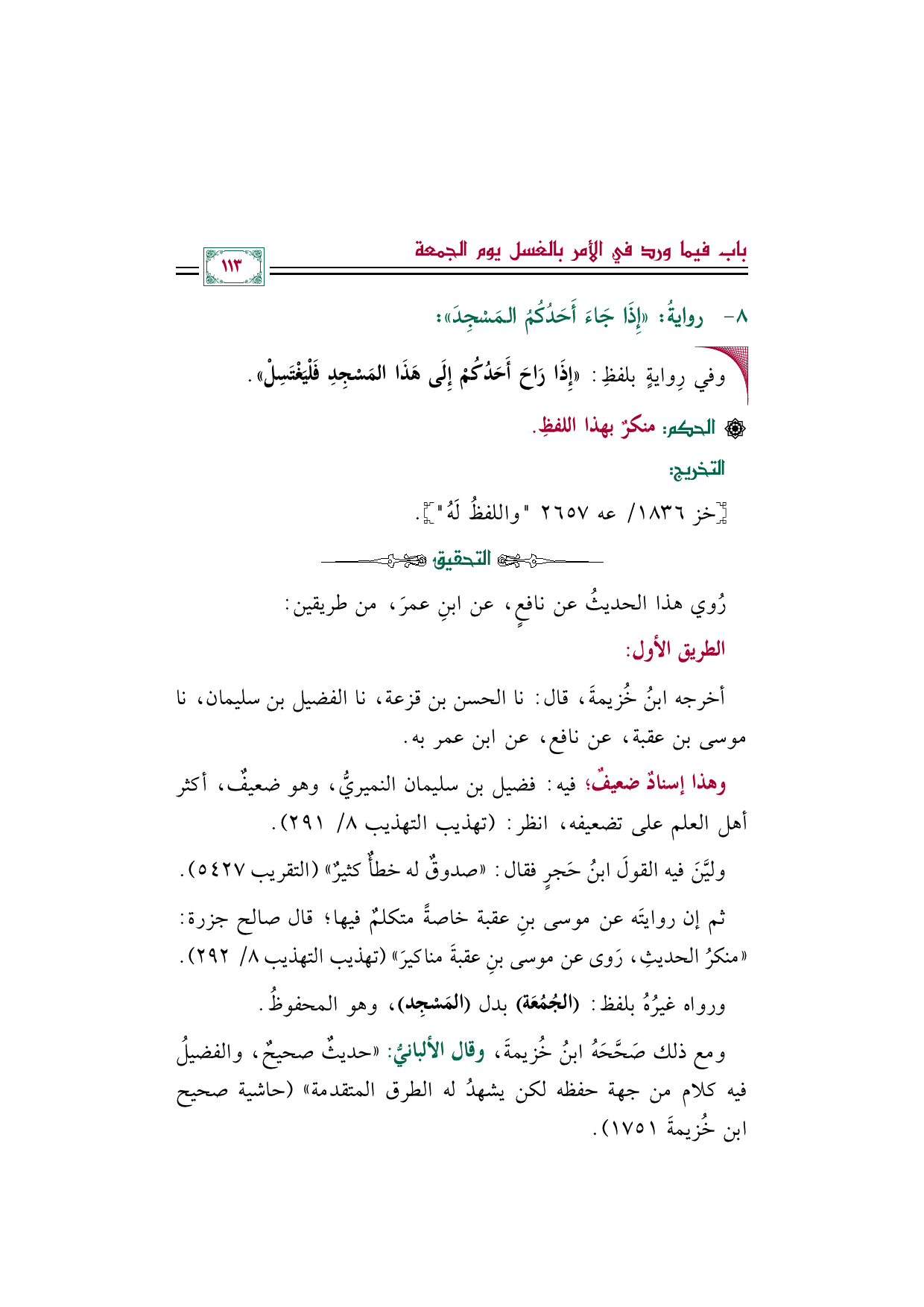 أخرجه ابنُ خُزيمةَ، قال: نا الحسن بن قزعة، نا الفضيل بن سليمان، نا موسى بن عقبة، عن نافع، عن ابن عمر به.