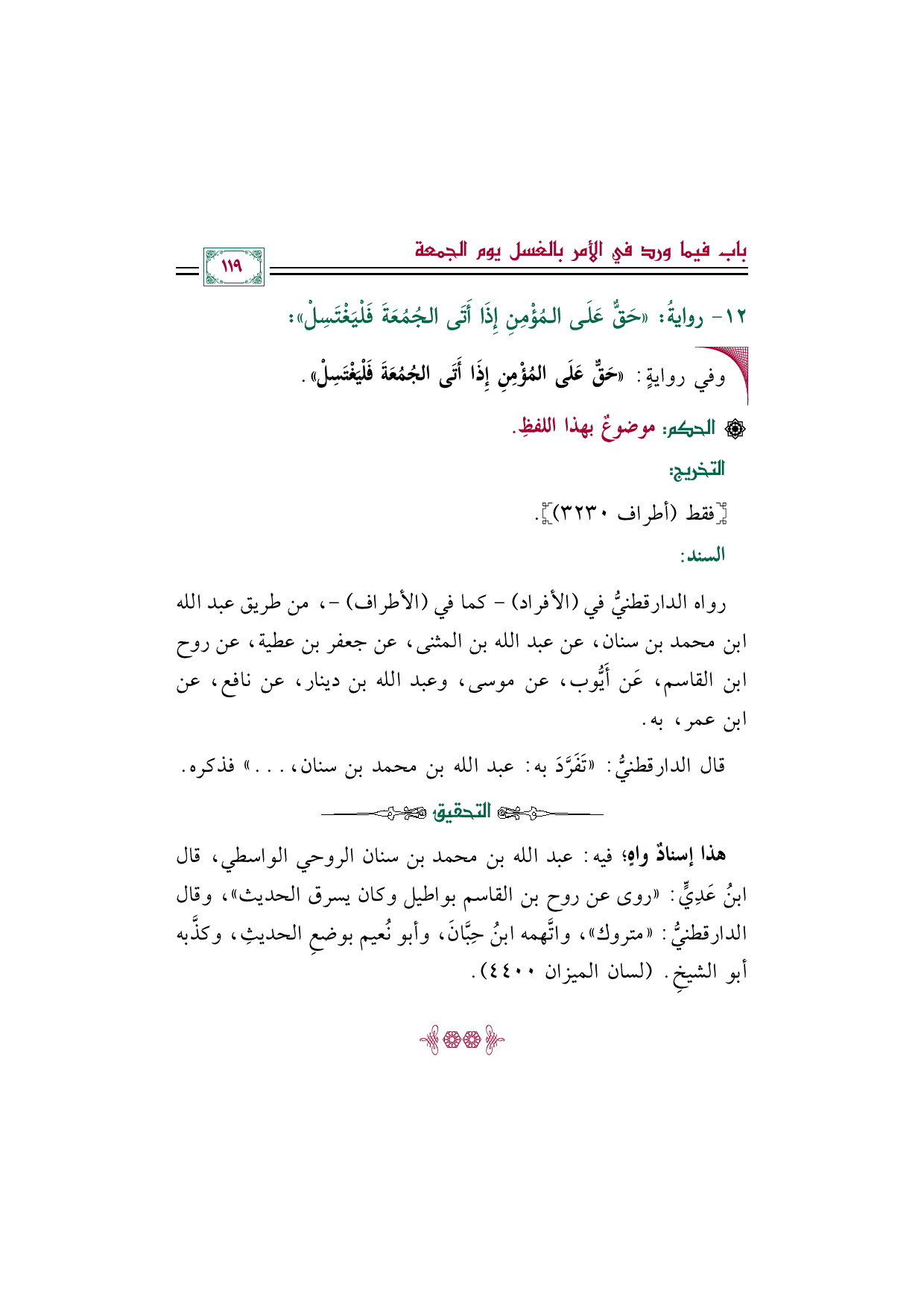 قال الدارقطنيُّ: "تَفَرَّدَ به: عبد الله بن محمد بن سنان، ... " فذكره.