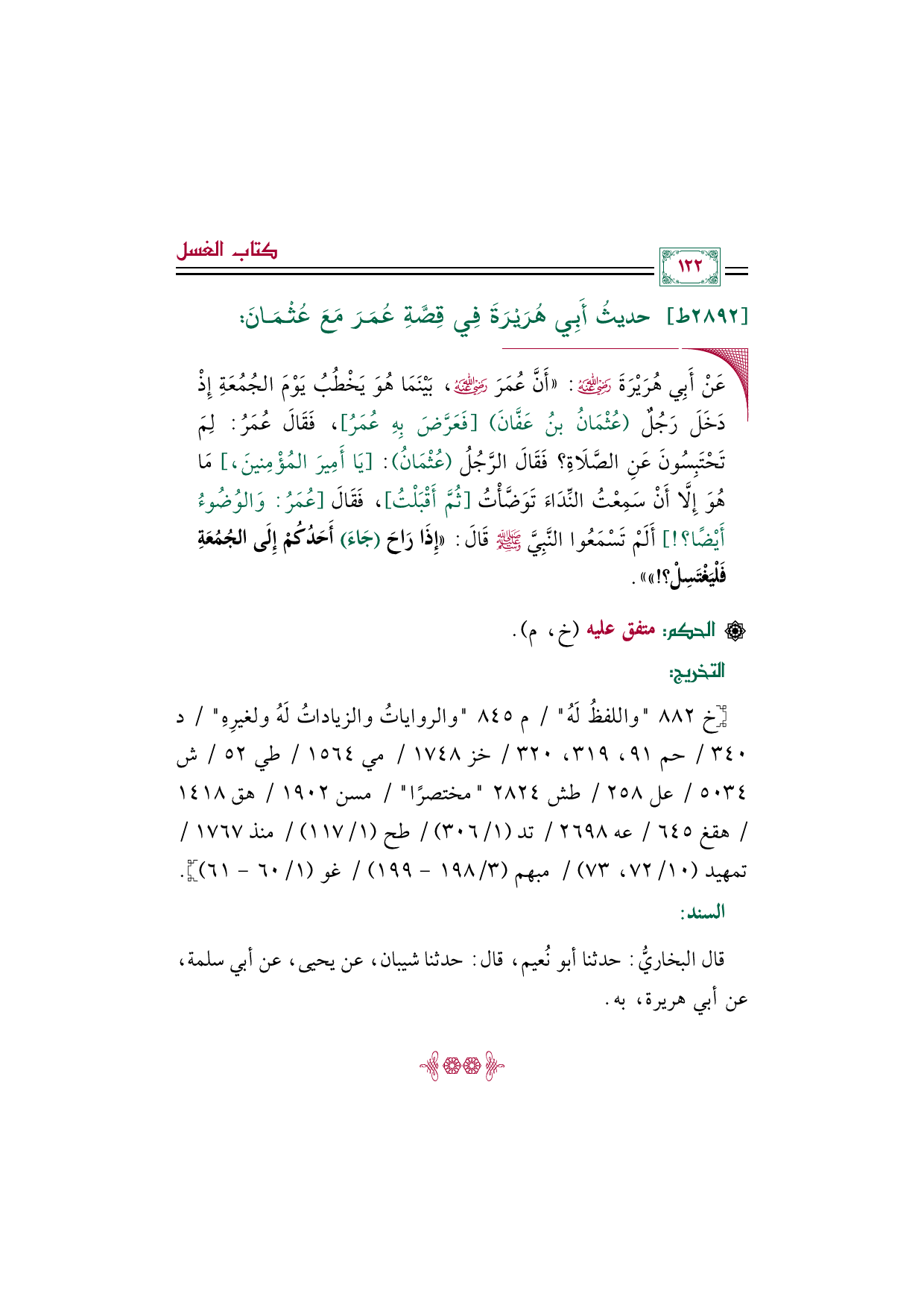 ◼ عَنْ أَبِي هُرَيْرَةَ رضي الله عنه: ((أَنَّ عُمَرَ رضي الله عنه، بَيْنَمَا هُوَ يَخْطُبُ يَوْمَ الجُمُعَةِ إِذْ دَخَلَ رَجُلٌ (عُثْمَانُ بنُ عَفَّانَ) [فَعَرَّضَ بِهِ عُمَرُ]، فَقَالَ عُمَرُ: لِمَ تَحْتَبِسُونَ عَنِ الصَّلَاةِ؟ فَقَالَ الرَّجُلُ (عُثْمَانُ): [يَا أَمِيرَ المُؤْمِنينَ، ] مَا هُوَ إِلَّا أَنْ سَمِعْتُ النِّدَاءَ تَوَضَّأْتُ [ثُمَّ أَقْبَلْتُ]، فَقَالَ [عُمَرُ: وَالوُضُوءُ أَيْضًا؟ ! ] أَلَمْ تَسْمَعُوا النَّبِيَّ صلى الله عليه وسلم قَالَ: ((إِذَا رَاحَ (جَاءَ) أَحَدُكُمْ إِلَى الجُمُعَةِ فَلْيَغْتَسِلْ؟ ! )))).
