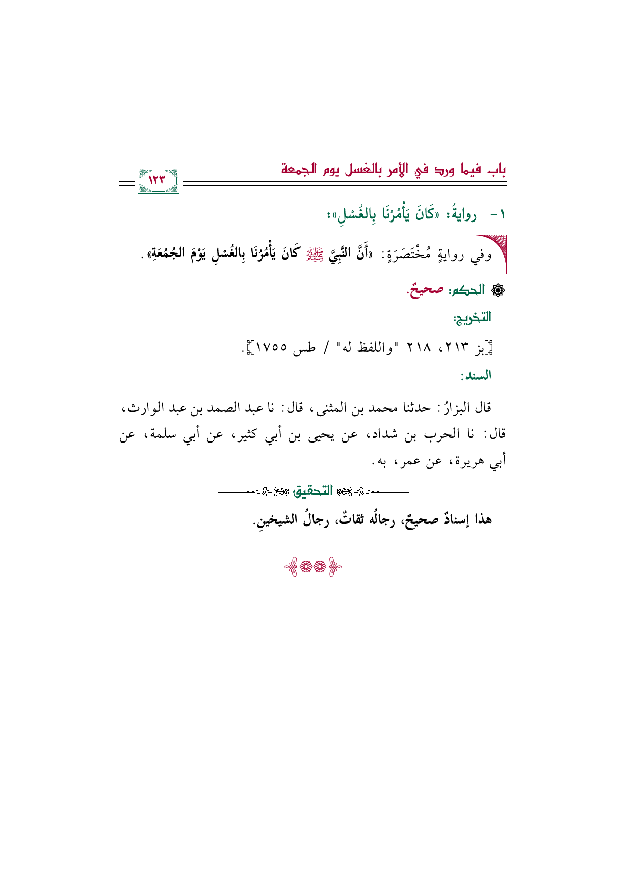 • وفي روايةٍ مُخْتَصَرَةٍ: ((أَنَّ النَّبِيَّ صلى الله عليه وسلم كَانَ يَأْمُرُنَا بِالغُسْلِ يَوْمَ الجُمُعَةِ)).
