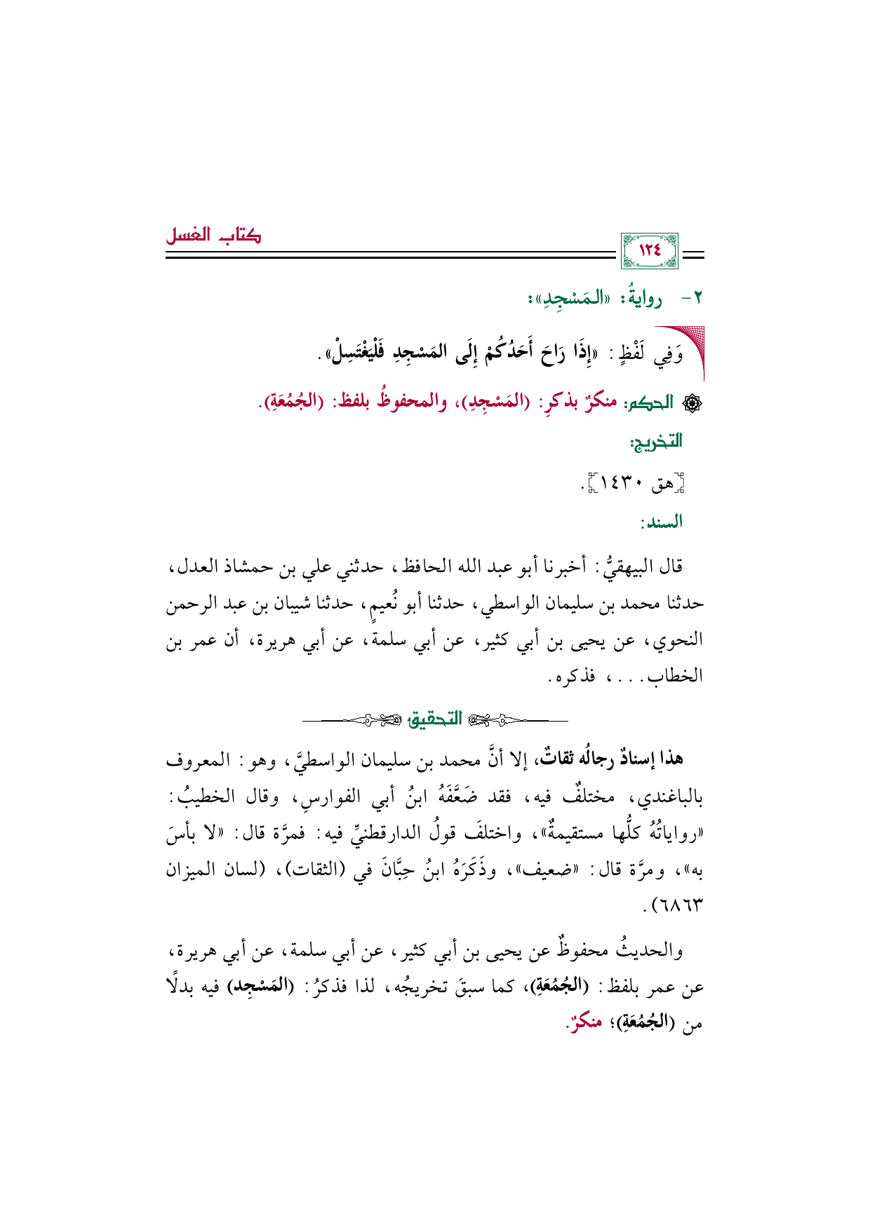 والحديثُ محفوظٌ عن يحيى بن أبي كثير، عن أبي سلمة، عن أبي هريرة، عن عمر بلفظ: (الجُمُعَةِ)، كما سبقَ تخريجُه، لذا فذكرُ: (المَسْجِد) فيه بدلًا من (الجُمُعَةِ)؛ منكرٌ.