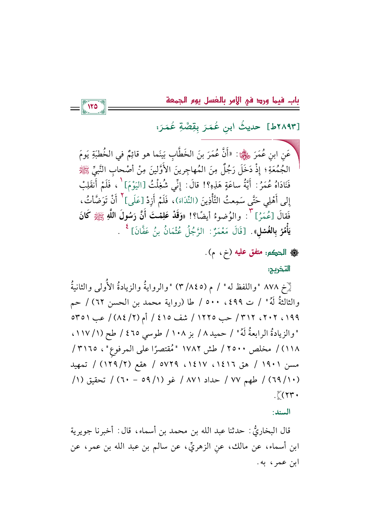 ◼ عَنِ ابنِ عُمَرَ رَضِي اللَّه عَنهُما: ((أَنَّ عُمَرَ بنَ الخَطَّابِ بَينَما هو قائِمٌ في الخُطبَةِ يَومَ الجُمُعَةِ؛ إِذْ دَخَلَ رَجُلٌ مِنَ المُهاجِرينَ الأَوَّلينَ مِنْ أصْحابِ النَّبيِّ صلى الله عليه وسلم فَنَادَاهُ عُمَرُ: أَيَّةُ ساعَةٍ هَذِهِ؟ ! قالَ: إِنِّي شُغِلْتُ [اليَوْمَ] ١، فَلَمْ أَنقَلِبْ إِلى أَهْلِي حَتَّى سَمِعتُ التَّأْذِينَ (النِّدَاءَ)، فَلَمْ أَزِدْ [عَلَى] ٢ أَنْ تَوَضَّأتُ، فَقالَ [عُمَرُ] ٣: والوُضوءُ أيضًا؟ ! ((وَقَدْ عَلِمْتَ أَنَّ رَسُولَ اللَّهِ صلى الله عليه وسلم كَانَ يَأْمُرُ بِالغُسْلِ)). [قَالَ مَعْمَرٌ: الرَّجُلُ عُثْمَانُ بنُ عَفَّانَ] ٤.