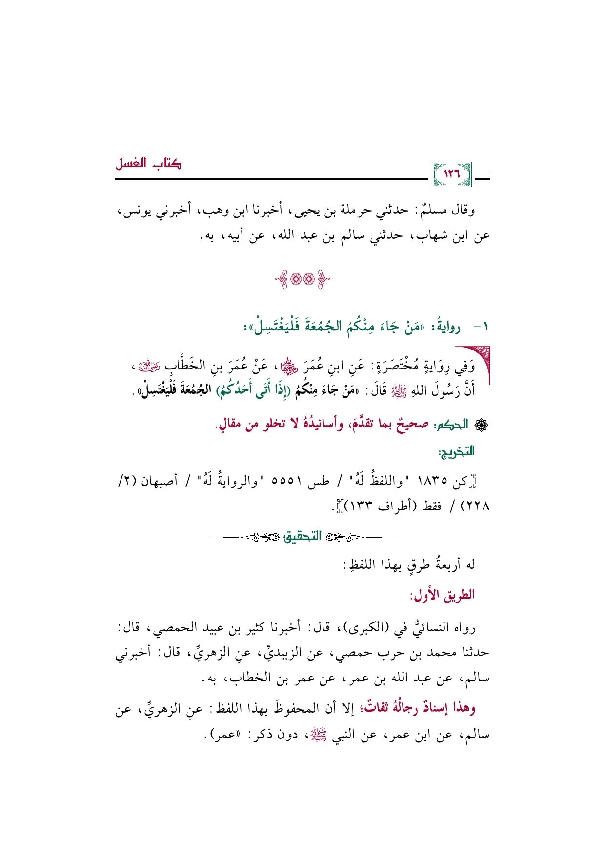 رواه النسائيُّ في (الكبرى)، قال: أخبرنا كثير بن عبيد الحمصي، قال: حدثنا محمد بن حرب حمصي، عن الزبيديِّ، عنِ الزهريِّ، قال: أخبرني سالم، عن عبد الله بن عمر، عن عمر بن الخطاب، به.