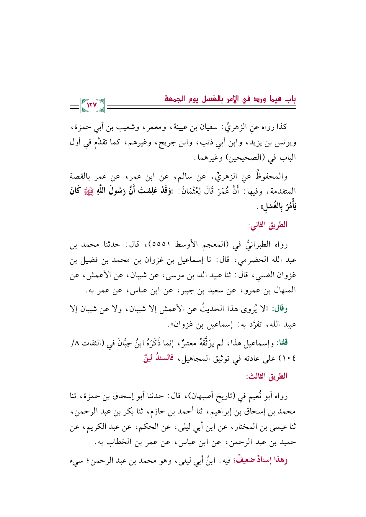 والمحفوظُ عنِ الزهريِّ، عن سالم، عن ابن عمر، عن عمر بالقصة المتقدمة، وفيها: أَنَّ عُمَرَ قَالَ لِعُثْمَانَ: ((وَقَدْ عَلِمْتَ أَنَّ رَسُولَ اللَّهِ صلى الله عليه وسلم كَانَ يَأْمُرُ بِالغُسْلِ)).