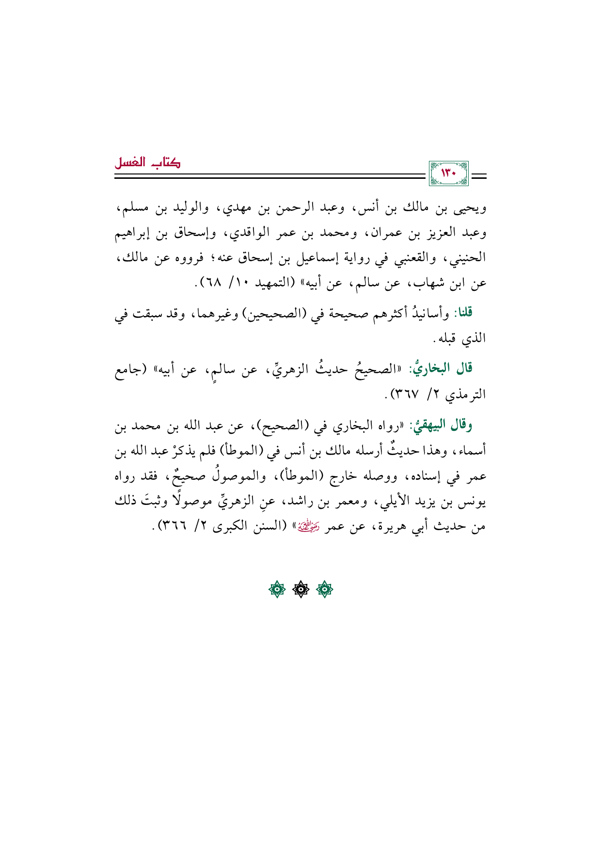 وقال البيهقيُّ: "رواه البخاري في (الصحيح)، عن عبد الله بن محمد بن أسماء، وهذا حديثٌ أرسله مالك بن أنس في (الموطأ) فلم يذكرْ عبد الله بن عمر في إسناده، ووصله خارج (الموطأ)، والموصولُ صحيحٌ، فقد رواه يونس بن يزيد الأيلي، ومعمر بن راشد، عنِ الزهريِّ موصولًا وثبتَ ذلك من حديث أبي هريرة، عن عمر رضي الله عنه" (السنن الكبرى ٢/ ٣٦٦).