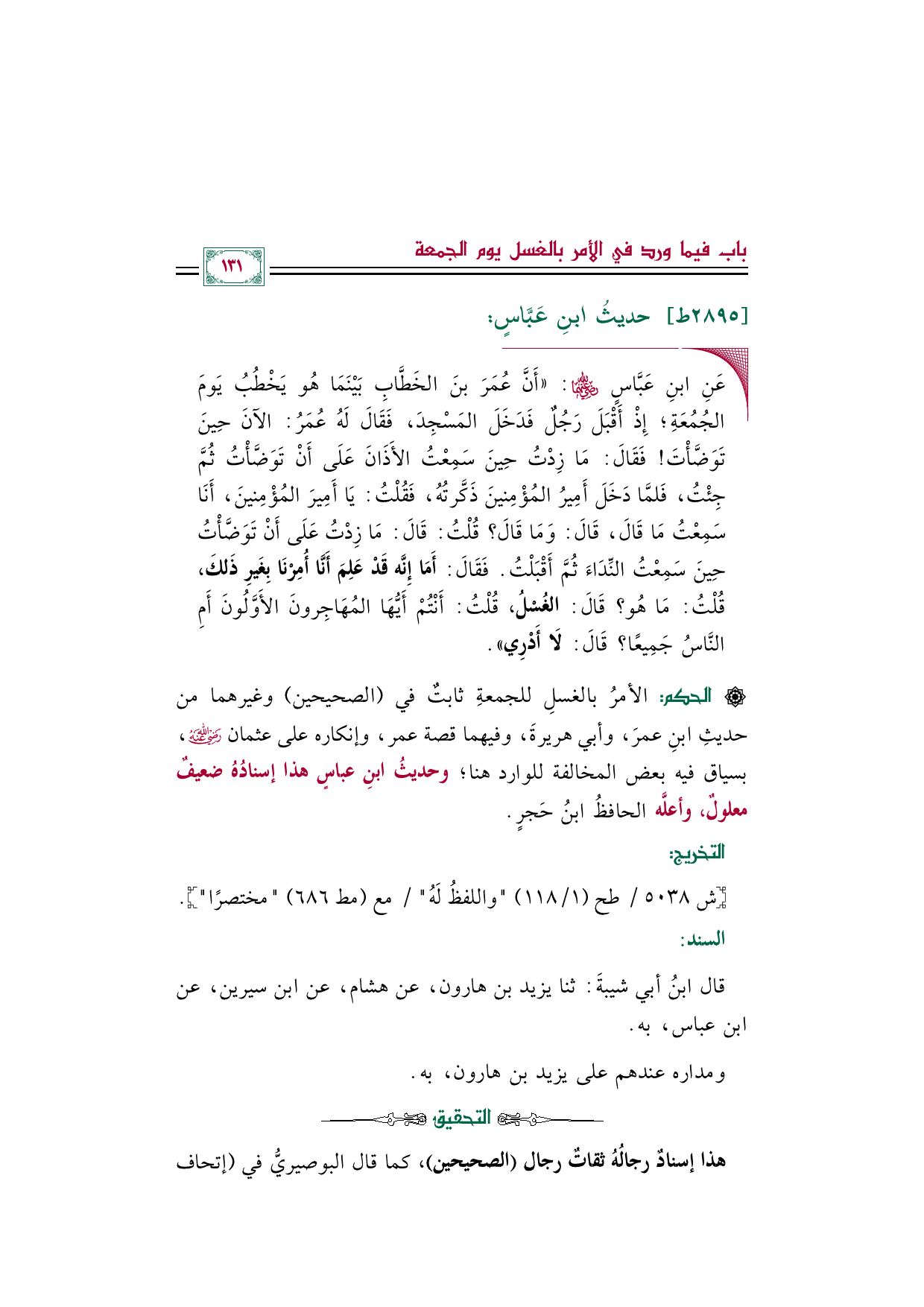 [الحكم]: الأمرُ بالغسلِ للجمعةِ ثابتٌ في (الصحيحين) وغيرهما من حديثِ ابنِ عمرَ، وأبي هريرةَ، وفيهما قصة عمر، وإنكاره على عثمان رضي الله عنه، بسياق فيه بعض المخالفة للوارد هنا؛ وحديثُ ابنِ عباسٍ هذا إسنادُهُ ضعيفٌ معلولٌ، وأعلَّه الحافظُ ابنُ حَجرٍ.