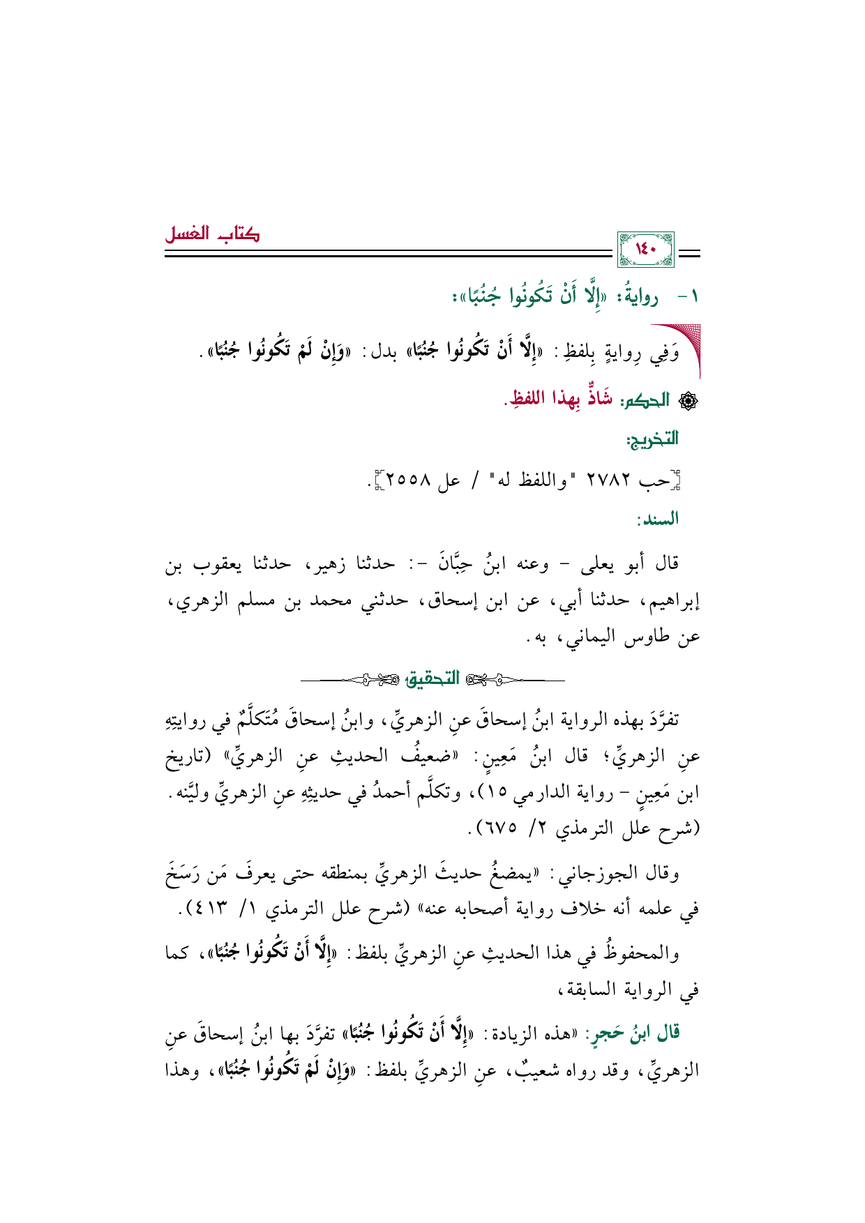 قال ابنُ حَجرٍ: "هذه الزيادة: ((إِلَّا أَنْ تَكُونُوا جُنُبًا)) تفرَّدَ بها ابنُ إسحاقَ عنِ الزهريِّ، وقد رواه شعيبٌ، عنِ الزهريِّ بلفظ: ((وَإِنْ لَمْ تَكُونُوا جُنُبًا))، وهذا