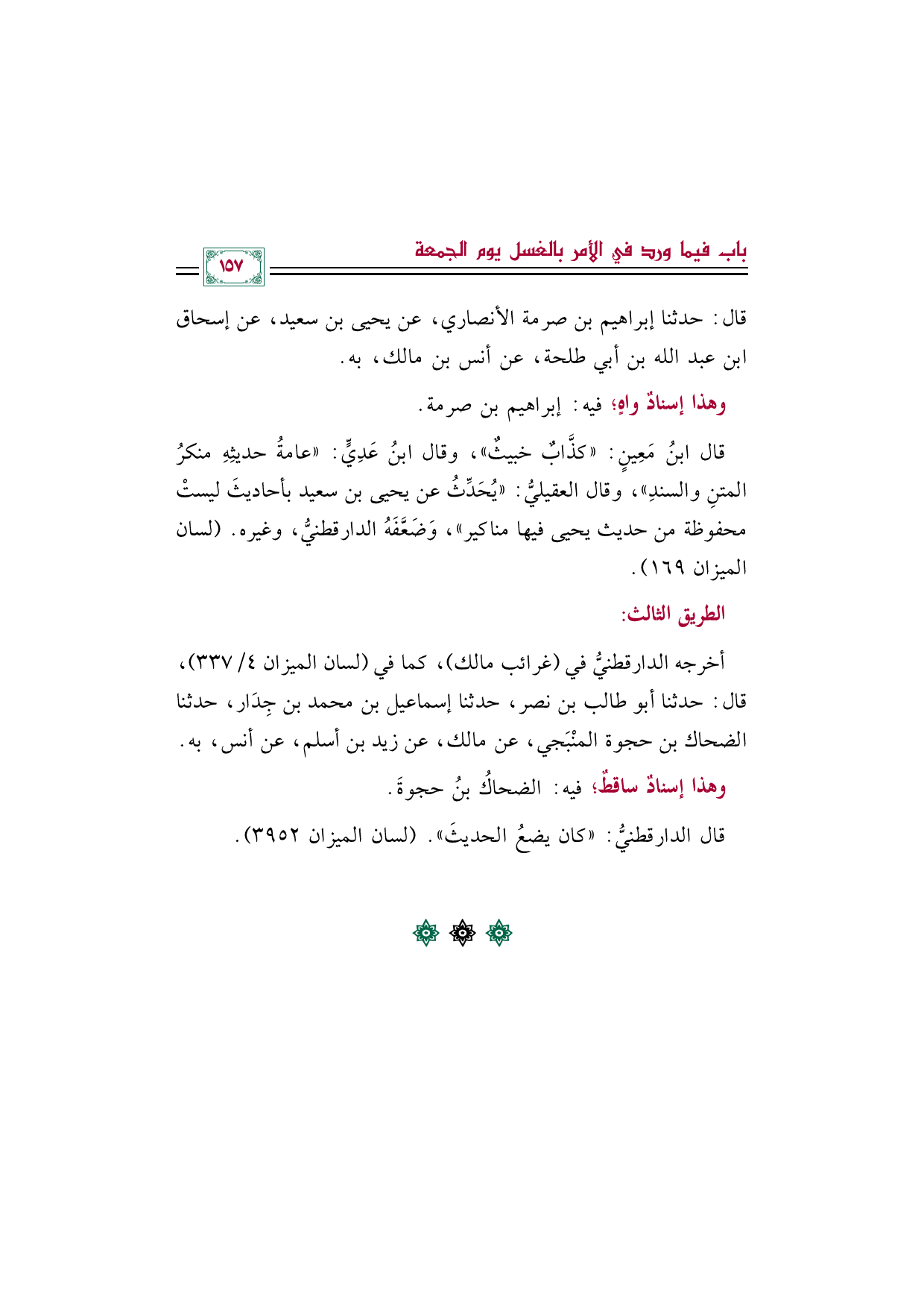 أخرجه الدارقطنيُّ في (غرائب مالك)، كما في (لسان الميزان ٤/ ٣٣٧)، قال: حدثنا أبو طالب بن نصر، حدثنا إسماعيل بن محمد بن جِدَار، حدثنا الضحاك بن حجوة المنْبَجي، عن مالك، عن زيد بن أسلم، عن أنس، به.