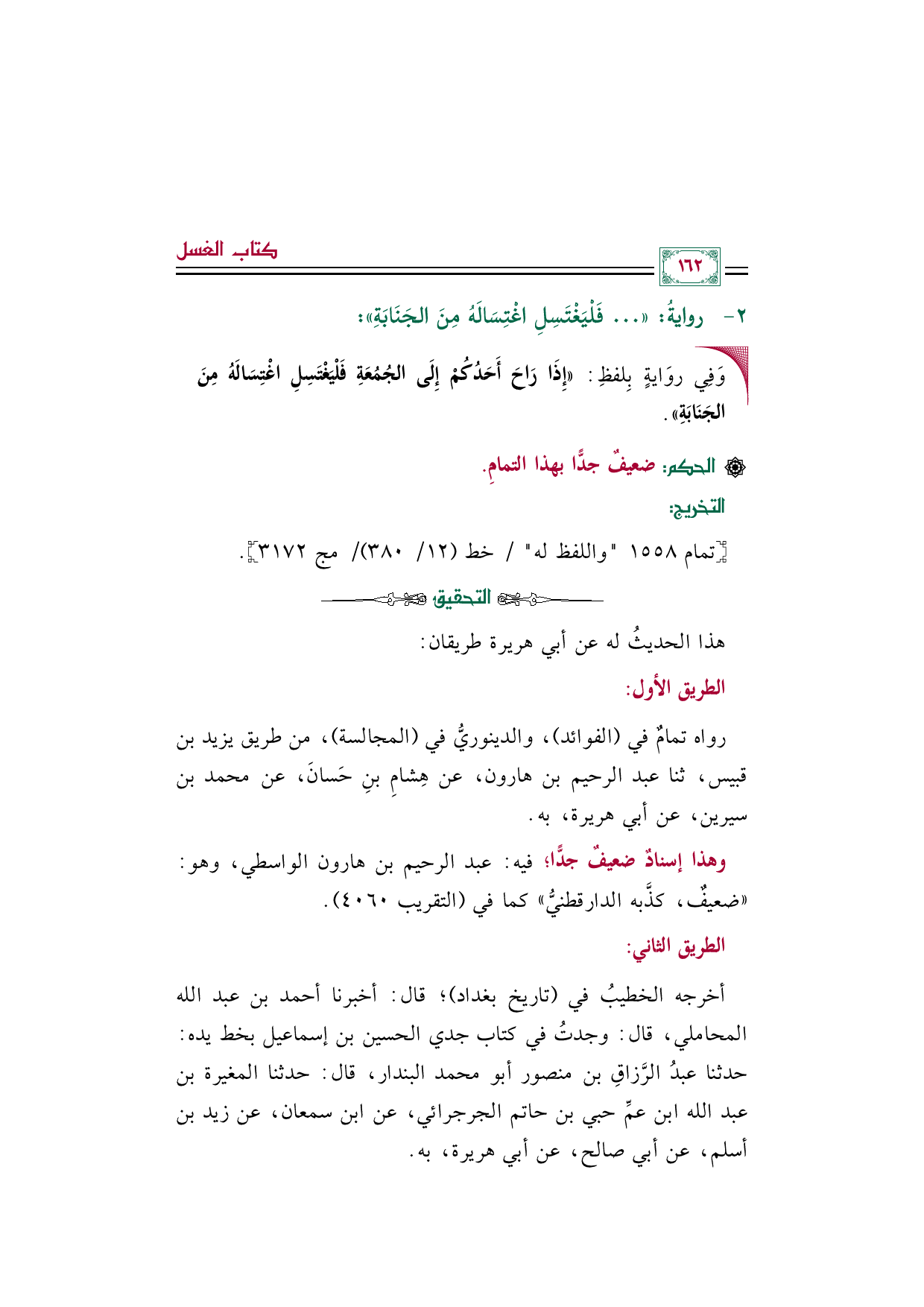 رواه تمامٌ في (الفوائد)، والدينوريُّ في (المجالسة)، من طريق يزيد بن قبيس، ثنا عبد الرحيم بن هارون، عن هِشامِ بنِ حَسانَ، عن محمد بن سيرين، عن أبي هريرة، به.