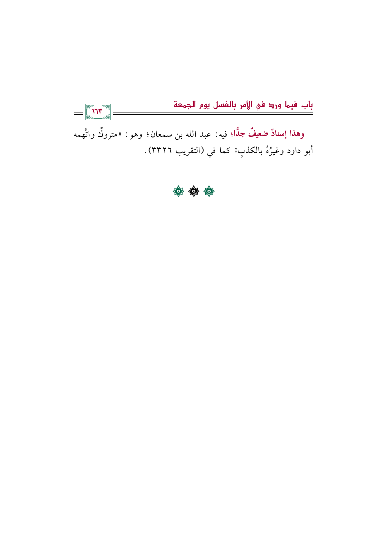 وهذا إسنادٌ ضعيفٌ جدًّا؛ فيه: عبد الله بن سمعان؛ وهو: "متروكٌ واتَّهمه أبو داود وغيرُهُ بالكذبِ" كما في (التقريب ٣٣٢٦).