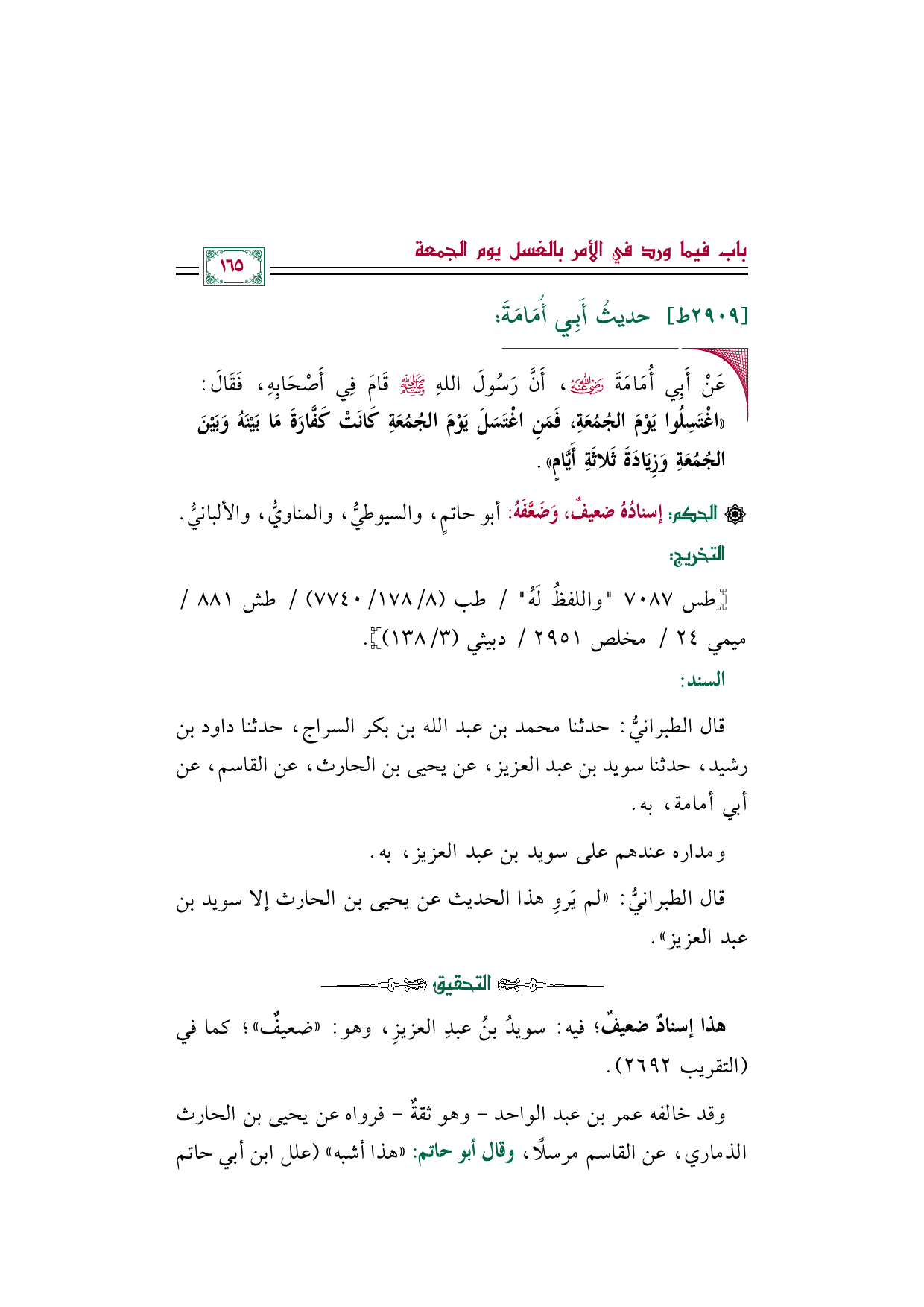 قال الطبرانيُّ: حدثنا محمد بن عبد الله بن بكر السراج، حدثنا داود بن رشيد، حدثنا سويد بن عبد العزيز، عن يحيى بن الحارث، عن القاسم، عن أبي أمامة، به.
