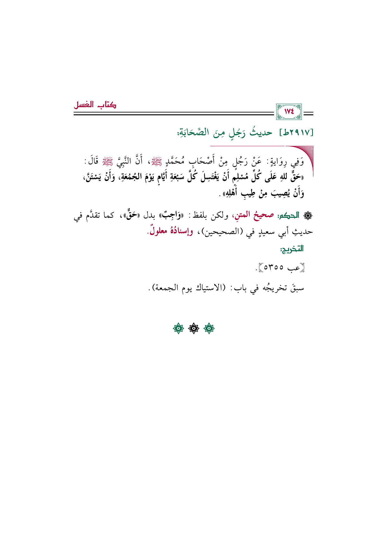 • وَفِي رِوَايةٍ: عَنْ رَجُلٍ مِنْ أَصْحَابِ مُحَمَّدٍ صلى الله عليه وسلم، أَنَّ النَّبِيَّ صلى الله عليه وسلم قَالَ: ((حَقٌّ للهِ عَلَى كُلِّ مُسْلِمٍ أَنْ يَغْتَسِلَ كُلَّ سَبْعَةِ أَيَّامٍ يَوْمَ الجُمُعَةِ، وَأَنْ يَسْتَنَّ، وَأَنْ يُصِيبَ مِنْ طِيبِ أَهْلِهِ)).