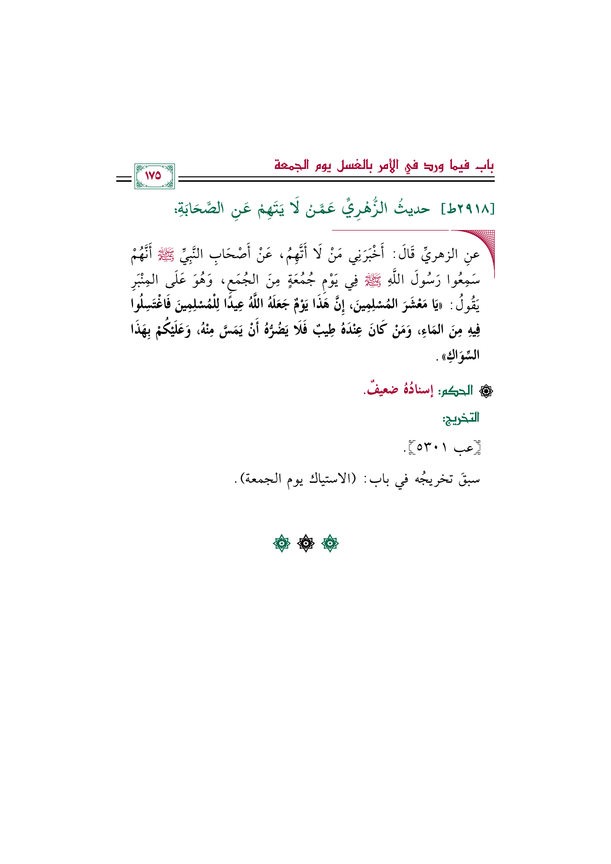 ◼ عنِ الزهريِّ قَالَ: أَخْبَرَنِي مَنْ لَا أَتَّهِمُ، عَنْ أَصْحَابِ النَّبِيِّ صلى الله عليه وسلم أَنَّهُمْ سَمِعُوا رَسُولَ اللَّهِ صلى الله عليه وسلم فِي يَوْمِ جُمُعَةٍ مِنَ الجُمَعِ، وَهُوَ عَلَى المِنْبَرِ يَقُولُ: ((يَا مَعْشَرَ المُسْلِمِينَ، إِنَّ هَذَا يَوْمٌ جَعَلَهُ اللَّهُ عِيدًا لِلْمُسْلِمِينَ فَاغْتَسِلُوا فِيهِ مِنَ المَاءِ، وَمَنْ كَانَ عِنْدَهُ طِيبٌ فَلَا يَضُرُّهُ أَنْ يَمَسَّ مِنْهُ، وَعَلَيْكُمْ بِهَذَا السِّوَاكِ)).