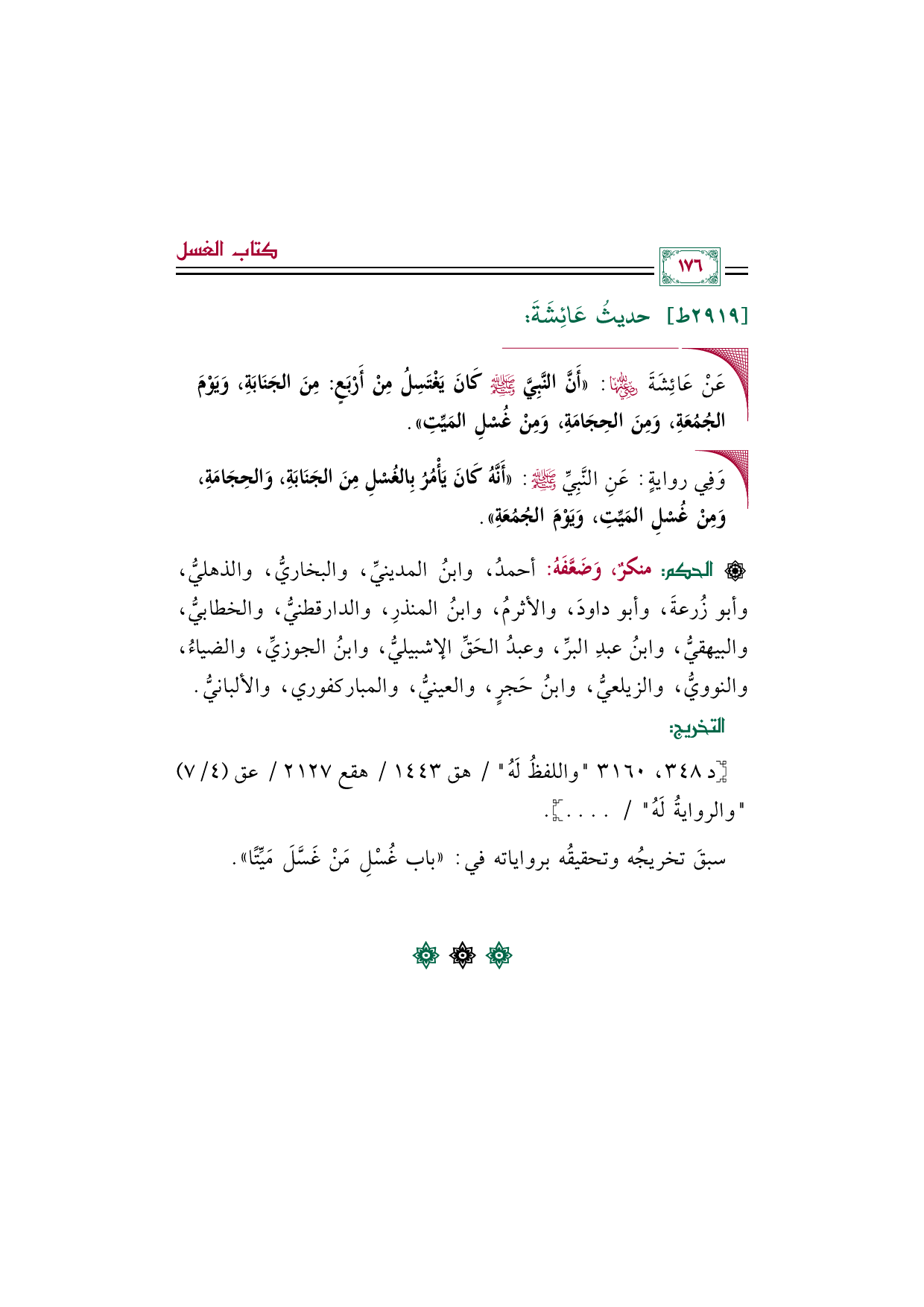 ◼ عَنْ عَائِشَةَ رضي الله عنها: ((أَنَّ النَّبِيَّ صلى الله عليه وسلم كَانَ يَغْتَسِلُ مِنْ أَرْبَعٍ: مِنَ الجَنَابَةِ، وَيَوْمَ الجُمُعَةِ، وَمِنَ الحِجَامَةِ، وَمِنْ غُسْلِ المَيِّتِ)).