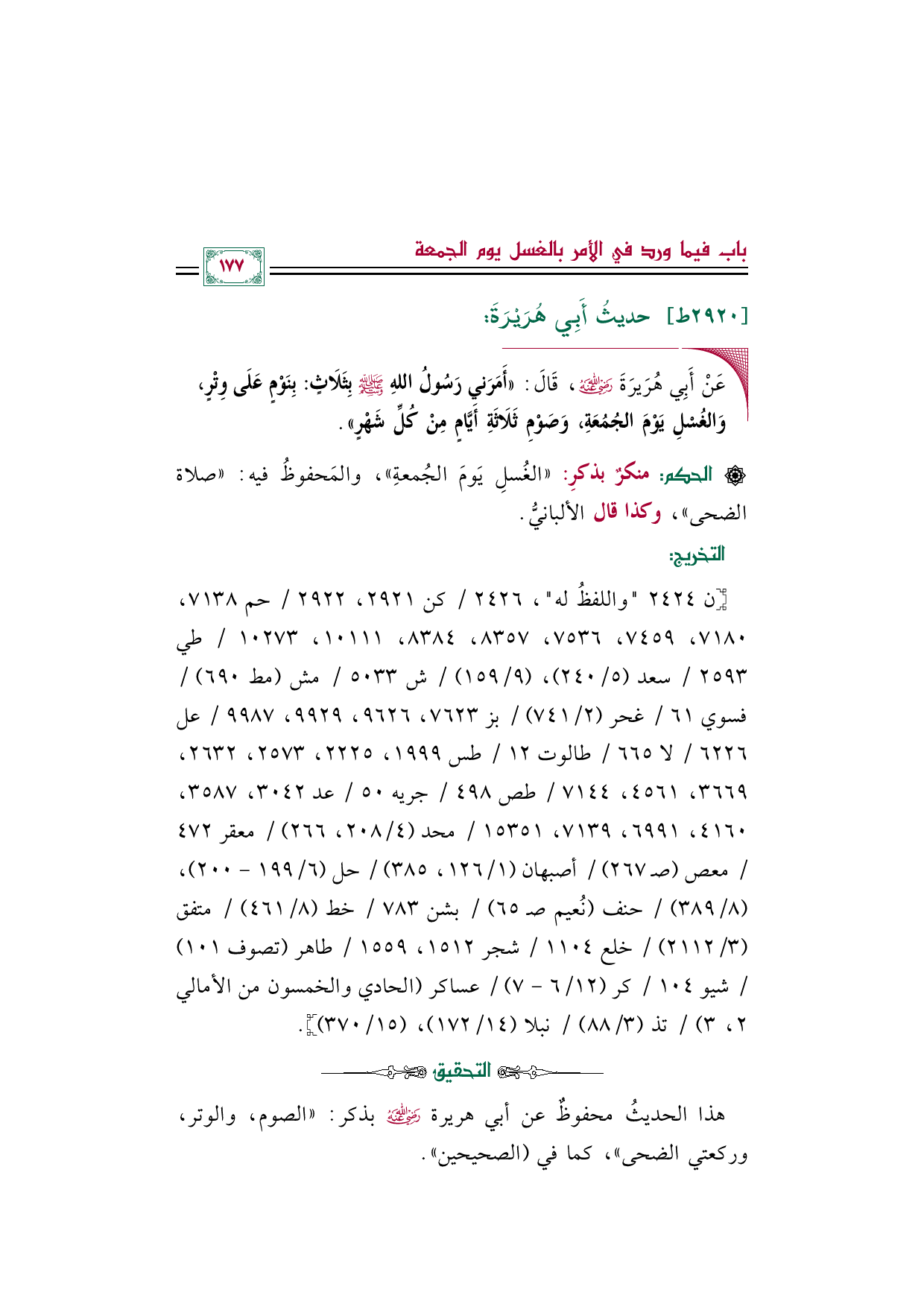◼ عَنْ أَبِي هُرَيرَةَ رضي الله عنه، قَالَ: ((أَمَرَني رَسُولُ اللهِ صلى الله عليه وسلم بِثَلَاثٍ: بِنَوْمٍ عَلَى وِتْرٍ، وَالغُسْلِ يَوْمَ الجُمُعَةِ، وَصَوْمِ ثَلَاثَةِ أَيَّامٍ مِنْ كُلِّ شَهْرٍ)).