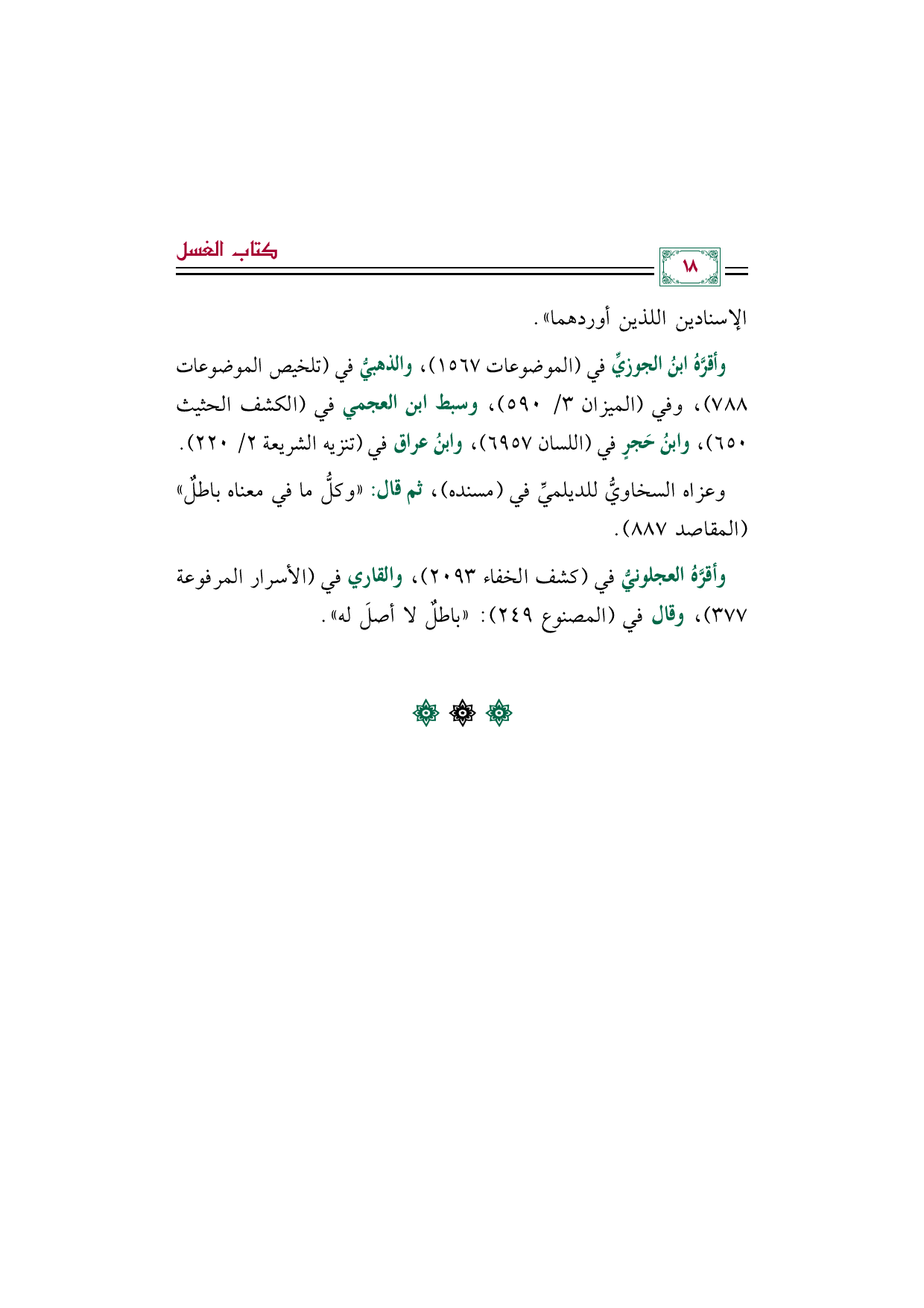 وأقرَّهُ العجلونيُّ في (كشف الخفاء ٢٠٩٣)، والقاري في (الأسرار المرفوعة ٣٧٧)، وقال في (المصنوع ٢٤٩): "باطلٌ لا أصلَ له".