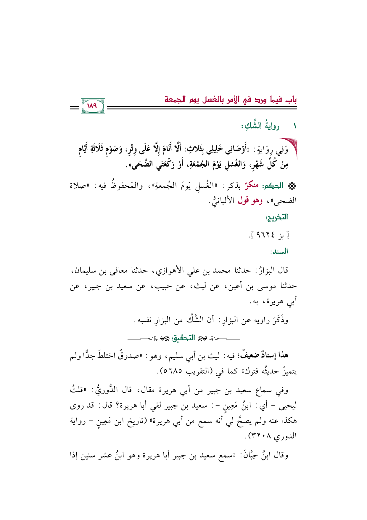 وذَكَرَ راويه عن البزارِ: أن الشَّكَّ من البزارِ نفسِه.