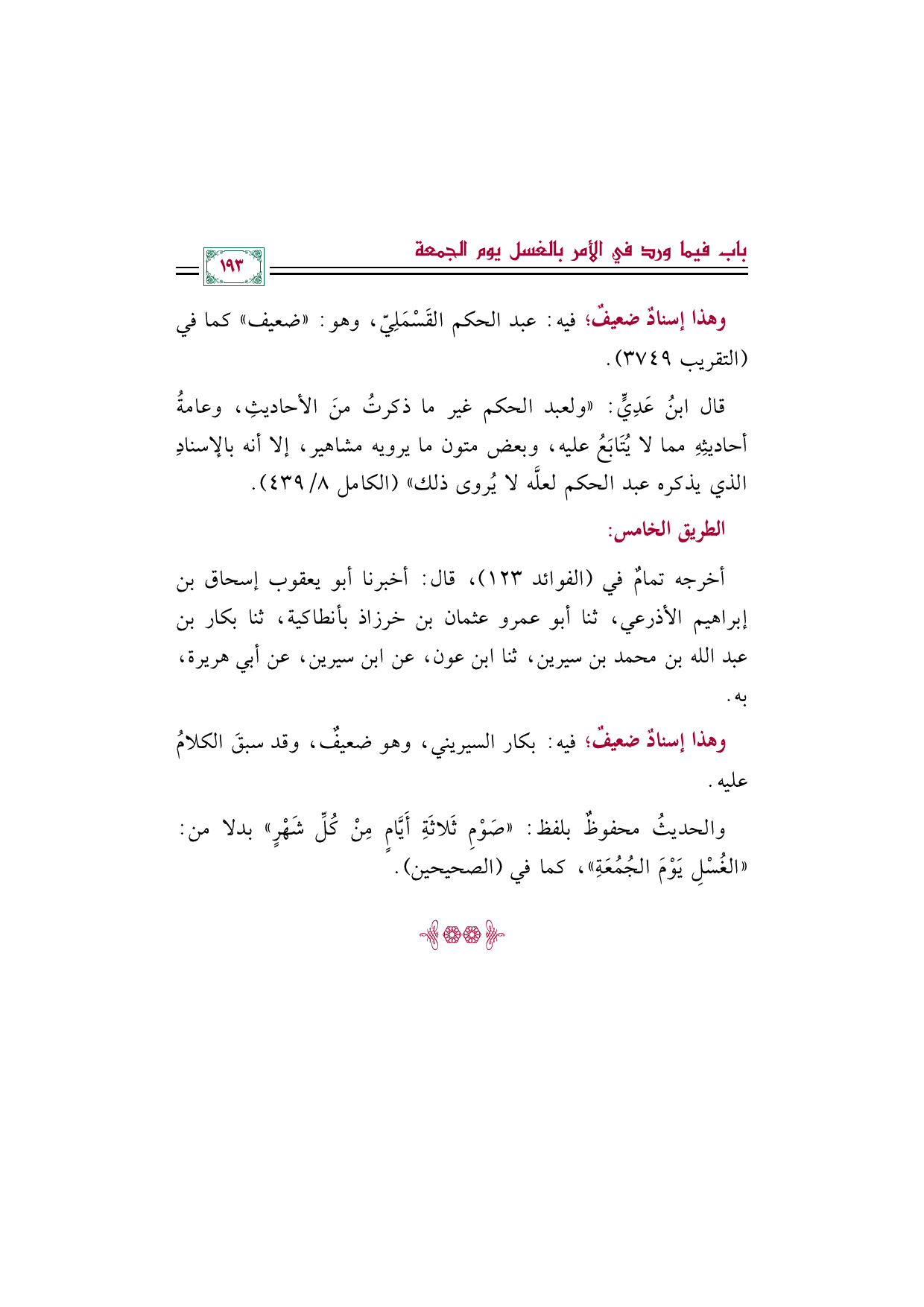 والحديثُ محفوظٌ بلفظ: ((صَوْمِ ثَلاثَةِ أَيَّامٍ مِنْ كُلِّ شَهْرٍ)) بدلا من: ((الغُسْلِ يَوْمَ الجُمُعَةِ))، كما في (الصحيحين).