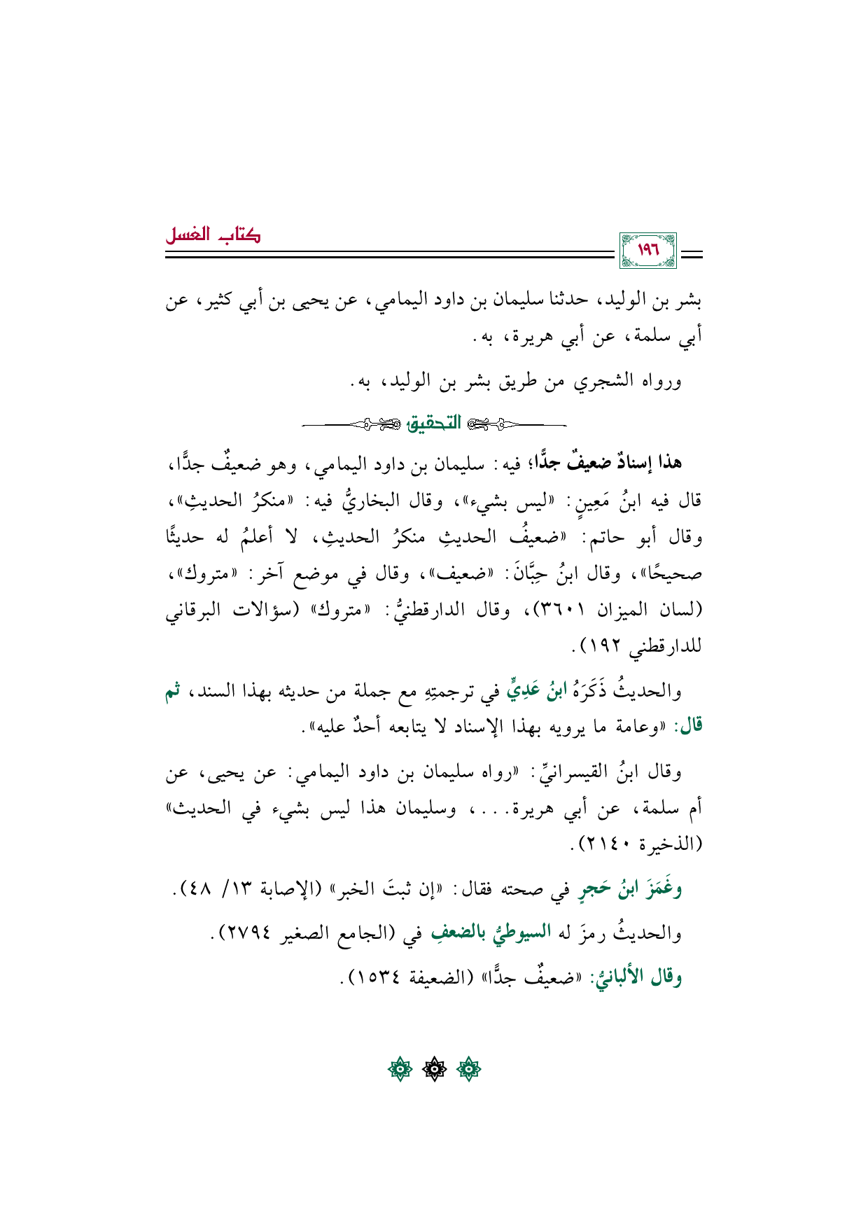 وقال ابنُ القيسرانيِّ: "رواه سليمان بن داود اليمامي: عن يحيى، عن أم سلمة، عن أبي هريرة ... ، وسليمان هذا ليس بشيء في الحديث" (الذخيرة ٢١٤٠).