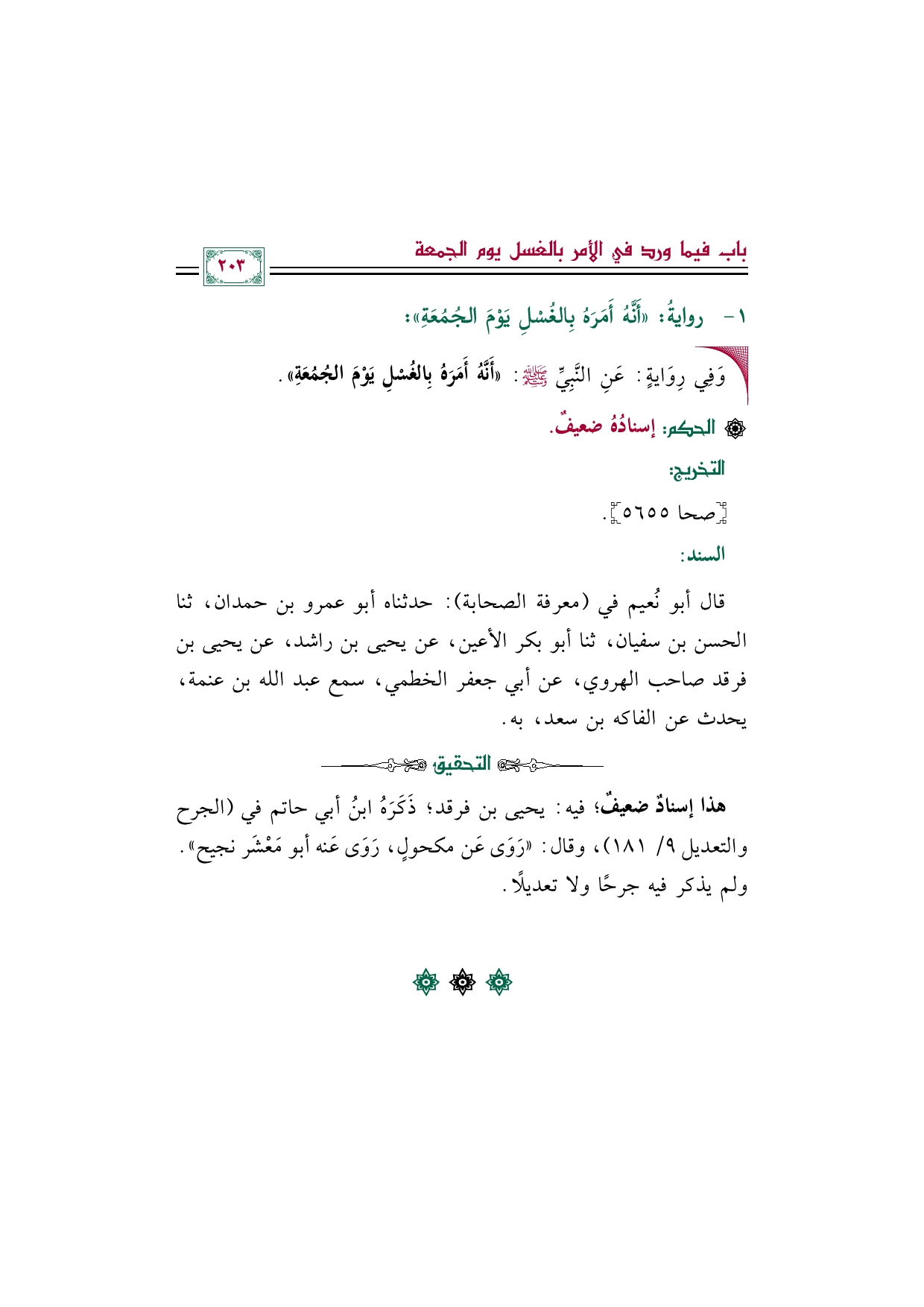 قال أبو نُعيم في (معرفة الصحابة): حدثناه أبو عمرو بن حمدان، ثنا الحسن بن سفيان، ثنا أبو بكر الأعين، عن يحيى بن راشد، عن يحيى بن فرقد صاحب الهروي، عن أبي جعفر الخطمي، سمع عبد الله بن عنمة، يحدث عن الفاكه بن سعد، به.