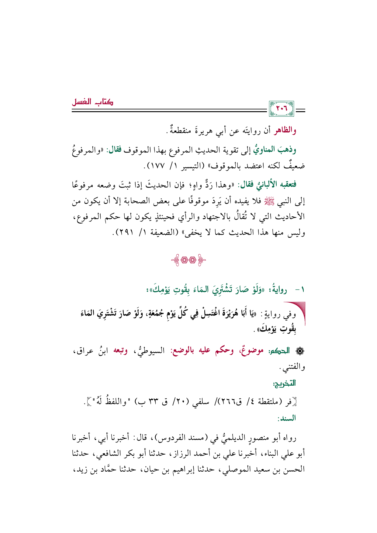 فتعقبه الألبانيُّ فقال: "وهذا رَدٌّ واهٍ؛ فإن الحديثَ إذا ثبتَ وضعه مرفوعًا إلى النبي صلى الله عليه وسلم فلا يفيده أن يَرِدَ موقوفًا على بعض الصحابة إلا أن يكون من الأحاديث التي لا تُقالُ بالاجتهاد والرأي فحينئذٍ يكون لها حكم المرفوع، وليس منها هذا الحديث كما لا يخفى" (الضعيفة ١/ ٢٩١).