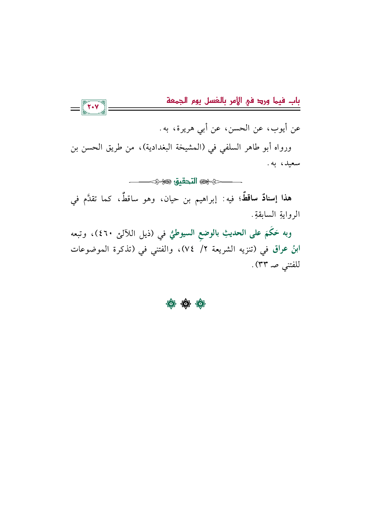 وبه حَكَمَ على الحديثِ بالوضعِ السيوطيُّ في (ذيل اللآلئ ٤٦٠)، وتبعه ابنُ عراق في (تنزيه الشريعة ٢/ ٧٤)، والفتني في (تذكرة الموضوعات للفتني صـ ٣٣).