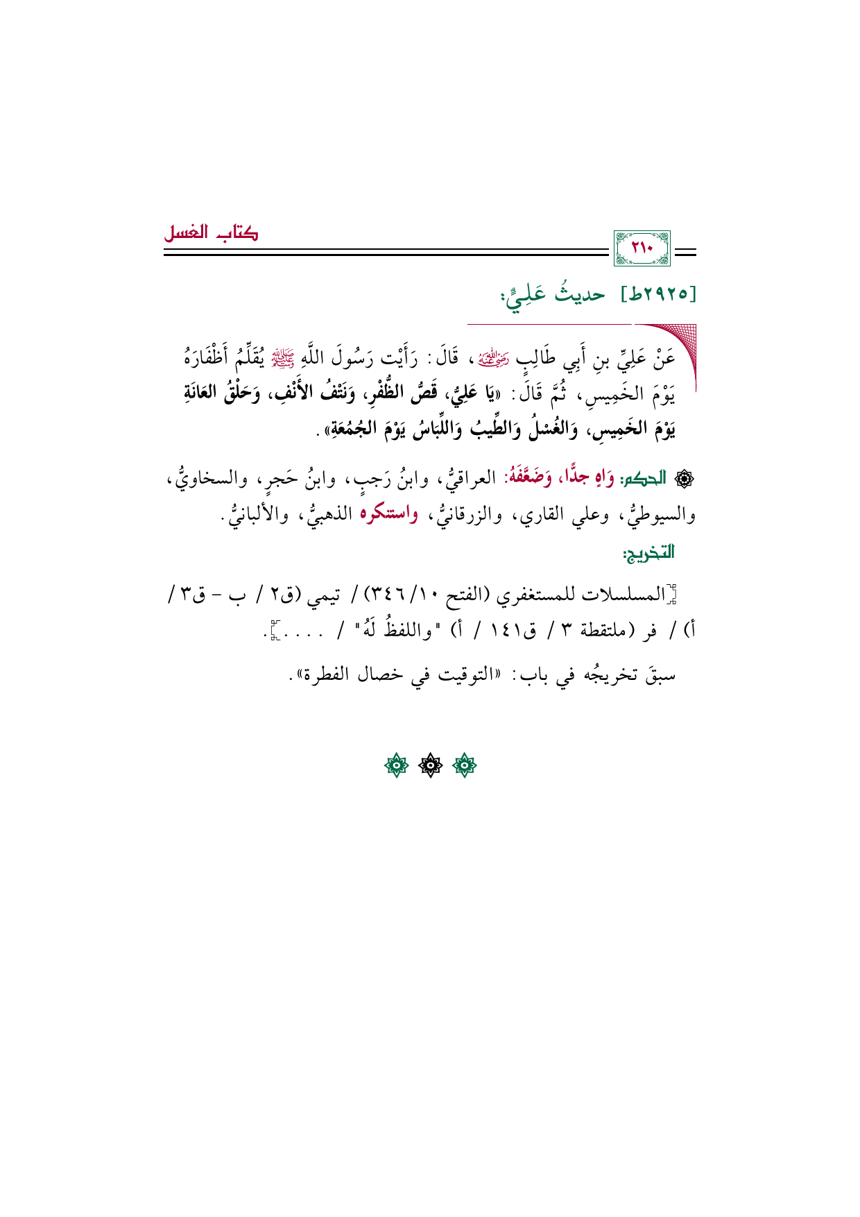 ◼ عَنْ عَلِيِّ بنِ أَبِي طَالِبٍ رضي الله عنه، قَالَ: رَأَيْت رَسُولَ اللَّهِ صلى الله عليه وسلم يُقَلِّمُ أَظْفَارَهُ يَوْمَ الخَمِيسِ، ثُمَّ قَالَ: ((يَا عَلِيُّ، قَصُّ الظُّفْرِ، وَنَتْفُ الأَنْفِ، وَحَلْقُ العَانَةِ يَوْمَ الخَمِيسِ، وَالغُسْلُ وَالطِّيبُ وَاللِّبَاسُ يَوْمَ الجُمُعَةِ)).