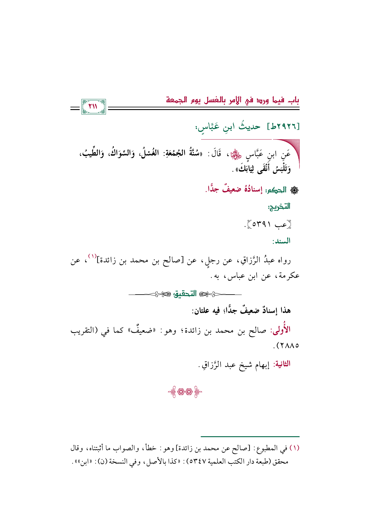 الأُولى: صالح بن محمد بن زائدة؛ وهو: "ضعيفٌ" كما في (التقريب ٢٨٨٥).