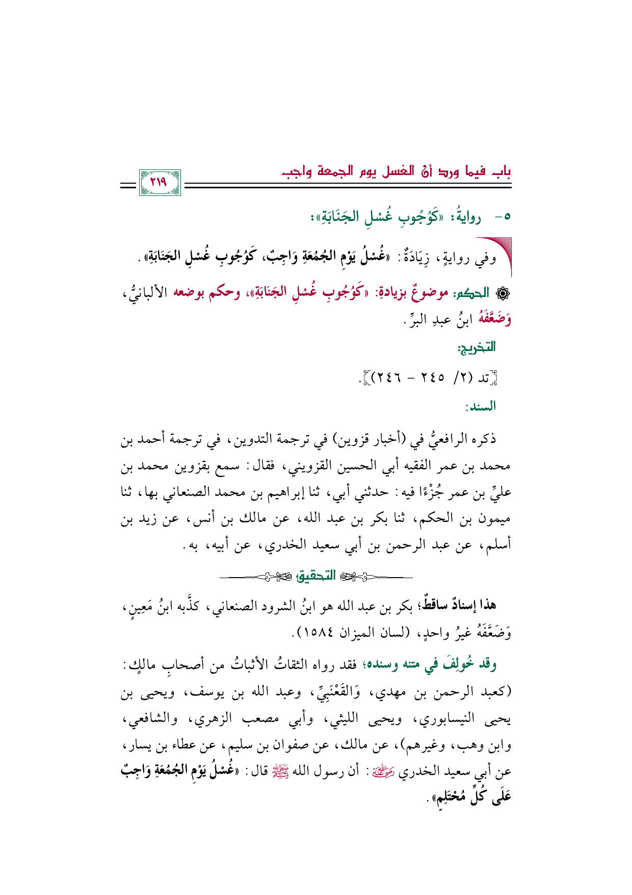 وقد خُولِفَ في متنه وسنده؛ فقد رواه الثقاتُ الأثباتُ من أصحابِ مالكٍ: (كعبد الرحمن بن مهدي، وَالقَعْنَبِيِّ، وعبد الله بن يوسف، ويحيى بن يحيى النيسابوري، ويحيى الليثي، وأبي مصعب الزهري، والشافعي، وابن وهب، وغيرهم)، عن مالك، عن صفوان بن سليم، عن عطاء بن يسار، عن أبي سعيد الخدري رضي الله عنه: أن رسول الله صلى الله عليه وسلم قال: ((غُسْلُ يَوْمِ الجُمُعَةِ وَاجِبٌ عَلَى كُلِّ مُحْتَلِمٍ)).
