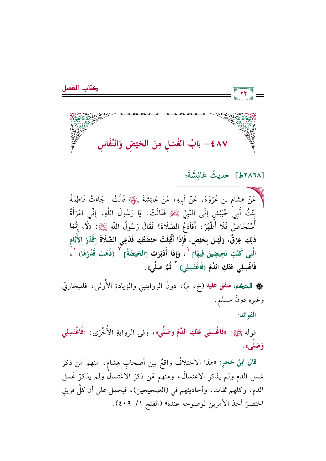قال ابنُ حَجرٍ: "هذا الاختلافُ واقعٌ بين أصحابِ هِشامٍ، منهم مَن ذكرَ غسل الدم ولم يذكرِ الاغتسالَ، ومنهم مَن ذكرَ الاغتسالَ ولم يذكرْ غَسل الدم، وكلهم ثقات، وأحاديثهم في (الصحيحين)، فيحمل على أن كلَّ فريقٍ اختصرَ أحدَ الأمرين لوضوحه عنده" (الفتح ١/ ٤٠٩).