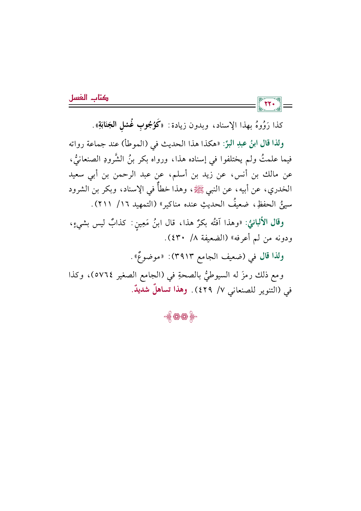 ومع ذلك رمزَ له السيوطيُّ بالصحةِ في (الجامع الصغير ٥٧٦٤)، وكذا في (التنوير للصنعاني ٧/ ٤٢٩). وهذا تساهلٌ شديدٌ.