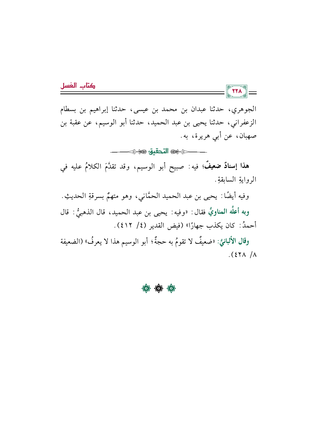 الجوهري، حدثنا عبدان بن محمد بن عيسى، حدثنا إبراهيم بن بسطام الزعفراني، حدثنا يحيى بن عبد الحميد، حدثنا أبو الوسيم، عن عقبة بن صهبان، عن أبي هريرة، به.