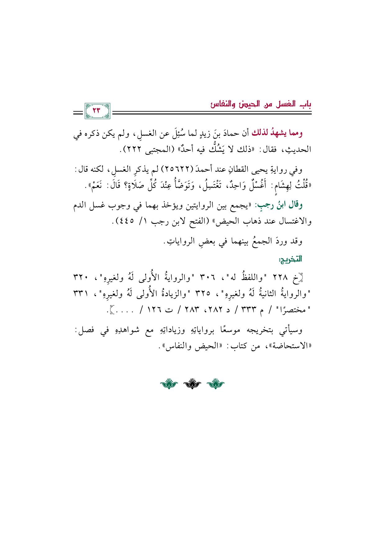 وقال ابنُ رجبٍ: "يجمع بين الروايتين ويؤخذ بهما في وجوب غسل الدم والاغتسال عند ذهاب الحيض" (الفتح لابن رجب ١/ ٤٤٥).