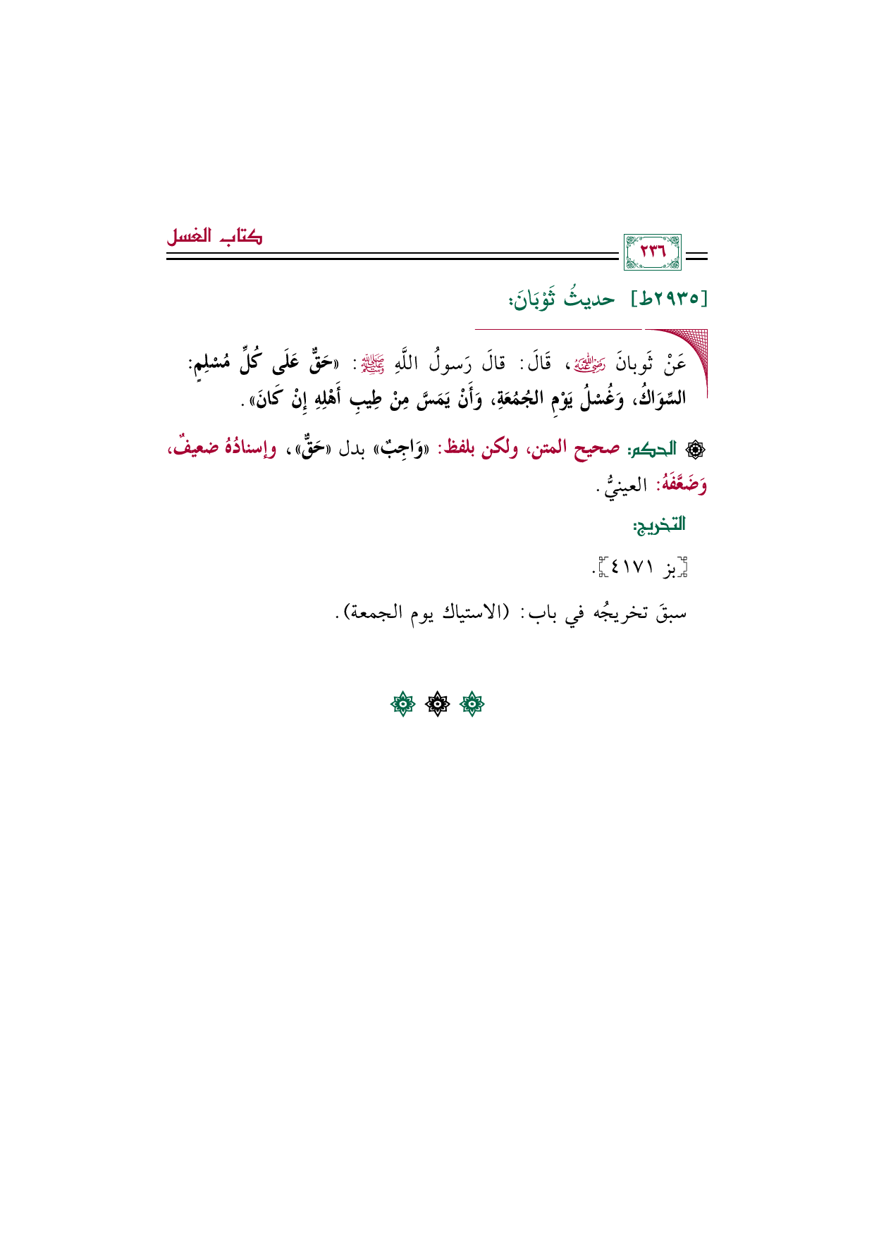 ◼ عَنْ ثَوبانَ رضي الله عنه، قَالَ: قالَ رَسولُ اللَّهِ صلى الله عيه وسلم: ((حَقٌّ عَلَى كُلِّ مُسْلِمٍ: السِّوَاكُ، وَغُسْلُ يَوْمِ الجُمُعَةِ، وَأَنْ يَمَسَّ مِنْ طِيبِ أَهْلِهِ إِنْ كَانَ)).