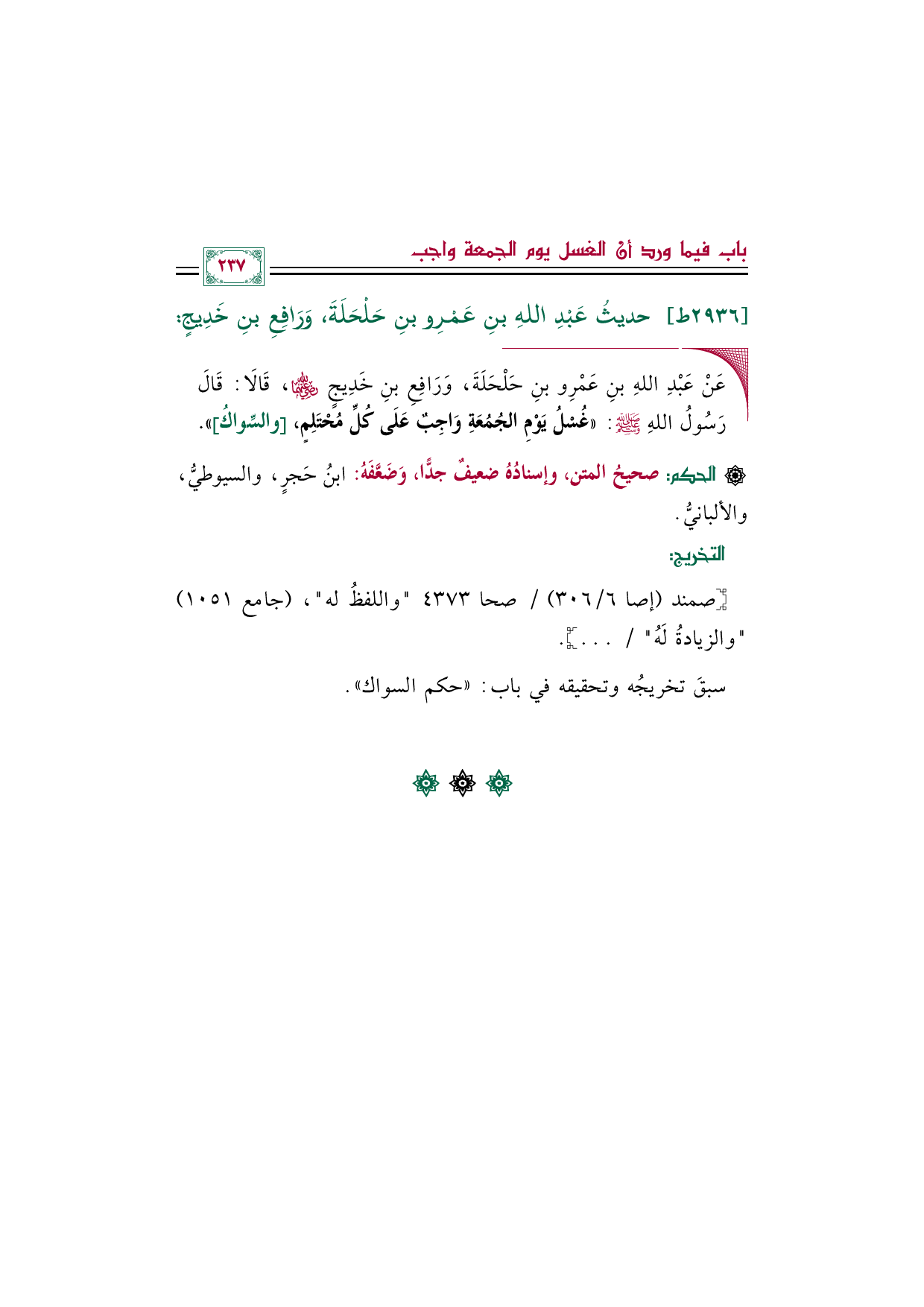 ◼ عَنْ عَبْدِ اللهِ بنِ عَمْرِو بنِ حَلْحَلَةَ، وَرَافِعِ بنِ خَدِيجٍ رضي الله عنهما، قَالَا: قَالَ رَسُولُ اللهِ صلى الله عليه وسلم: ((غُسْلُ يَوْمِ الجُمُعَةِ وَاجِبٌ عَلَى كُلِّ مُحْتَلِمٍ، [والسِّواكُ])).