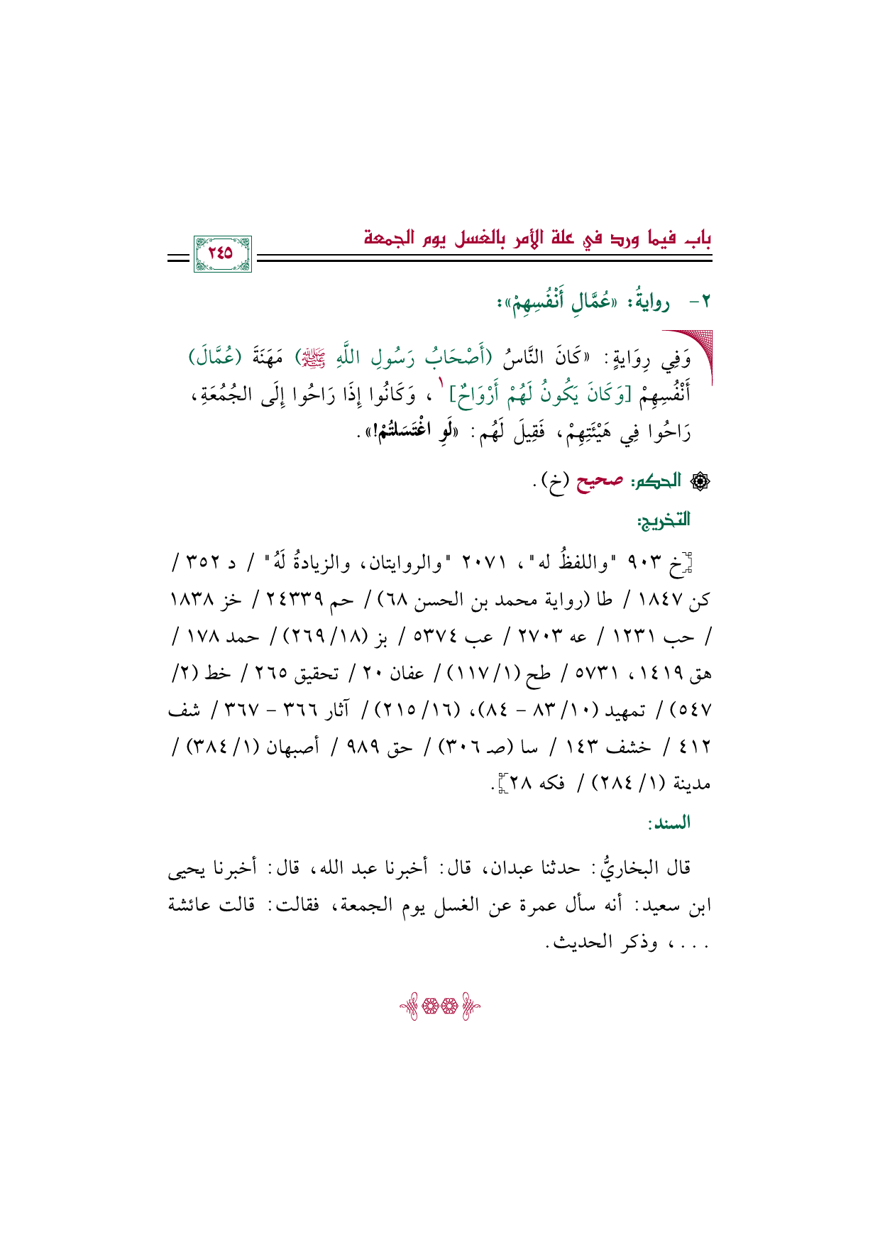 قال البخاريُّ: حدثنا عبدان، قال: أخبرنا عبد الله، قال: أخبرنا يحيى بن سعيد: أنه سأل عمرة عن الغسل يوم الجمعة، فقالت: قالت عائشة ... ، وذكر الحديث.