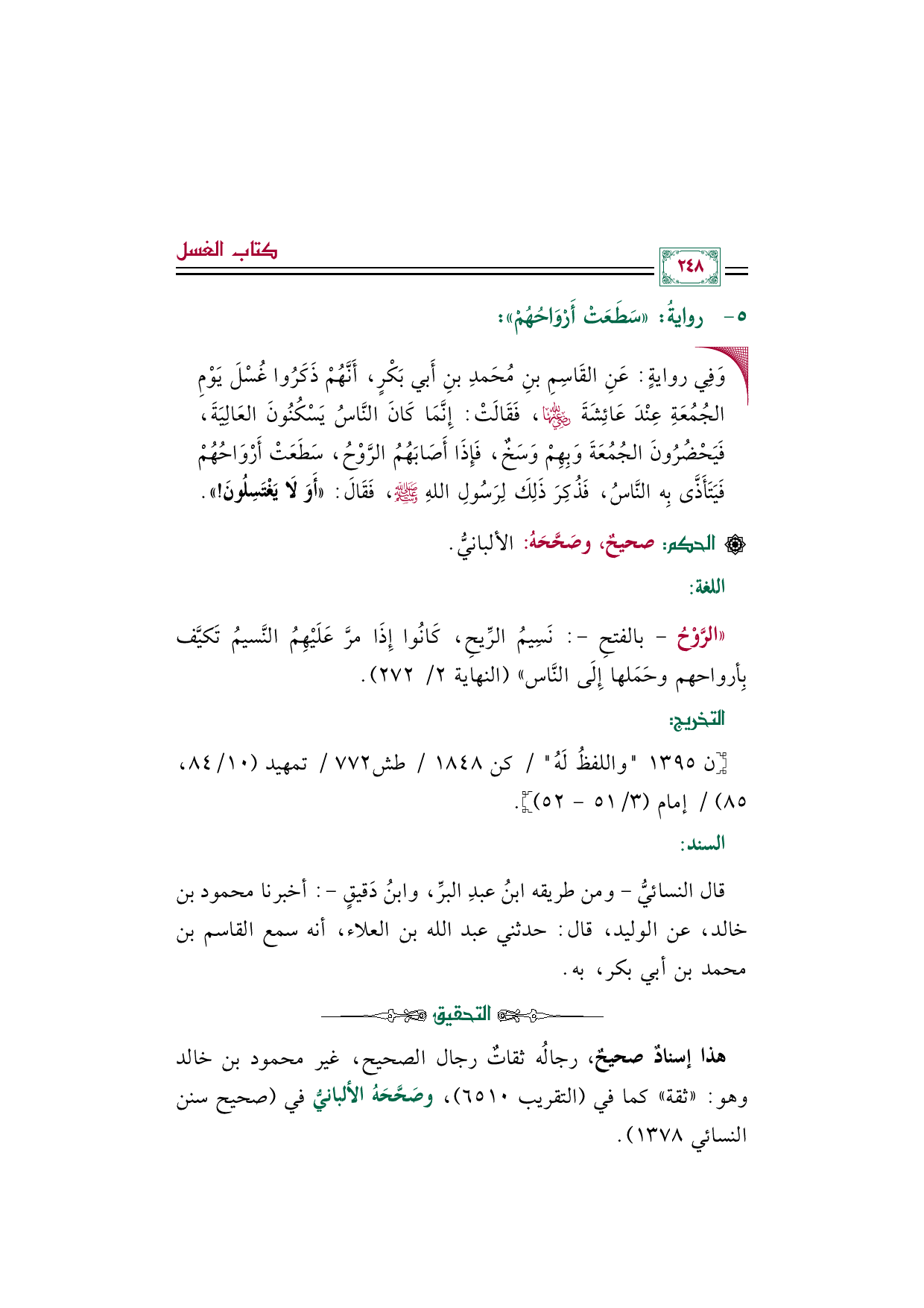 قال النسائيُّ -ومن طريقه ابنُ عبدِ البرِّ، وابنُ دَقيقٍ-: أخبرنا محمود بن خالد، عن الوليد، قال: حدثني عبد الله بن العلاء، أنه سمع القاسم بن محمد بن أبي بكر، به