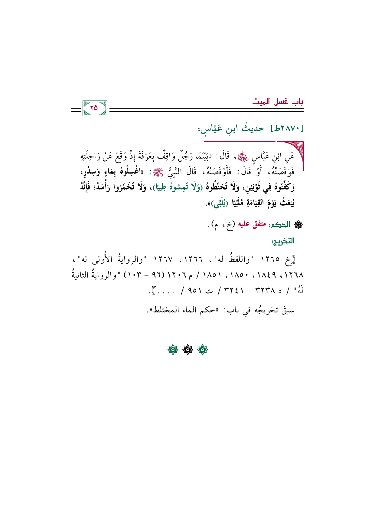 ◼ عَنِ ابْنِ عَبَّاسٍ رضي الله عنهما، قَالَ: ((بَيْنَمَا رَجُلٌ وَاقِفٌ بِعَرَفَةَ إِذْ وَقَعَ عَنْ رَاحِلَتِهِ فَوَقَصَتْهُ، أَوْ قَالَ: فَأَوْقَصَتْهُ، قَالَ النَّبِيُّ صلى الله عليه وسلم: ((اغْسِلُوهُ بِمَاءٍ وَسِدْرٍ، وَكَفِّنُوهُ فِي ثَوْبَيْنِ، وَلَا تُحَنِّطُوهُ (وَلَا تُمِسُّوهُ طِيبًا)، وَلَا تُخَمِّرُوا رَأْسَهُ؛ فَإِنَّهُ يُبْعَثُ يَوْمَ القِيَامَةِ مُلَبِّيًا (يُلَبِّي))).