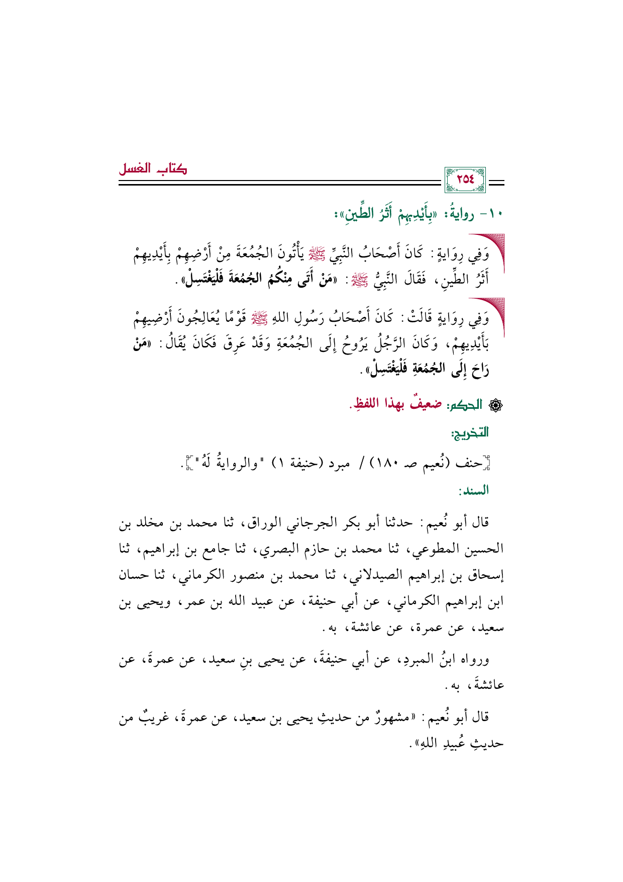 قال أبو نُعيم: حدثنا أبو بكر الجرجاني الوراق، ثنا محمد بن مخلد بن الحسين المطوعي، ثنا محمد بن حازم البصري، ثنا جامع بن إبراهيم، ثنا إسحاق بن إبراهيم الصيدلاني، ثنا محمد بن منصور الكرماني، ثنا حسان بن إبراهيم الكرماني، عن أبي حنيفة، عن عبيد الله بن عمر، ويحيى بن سعيد، عن عمرة، عن عائشة، به.