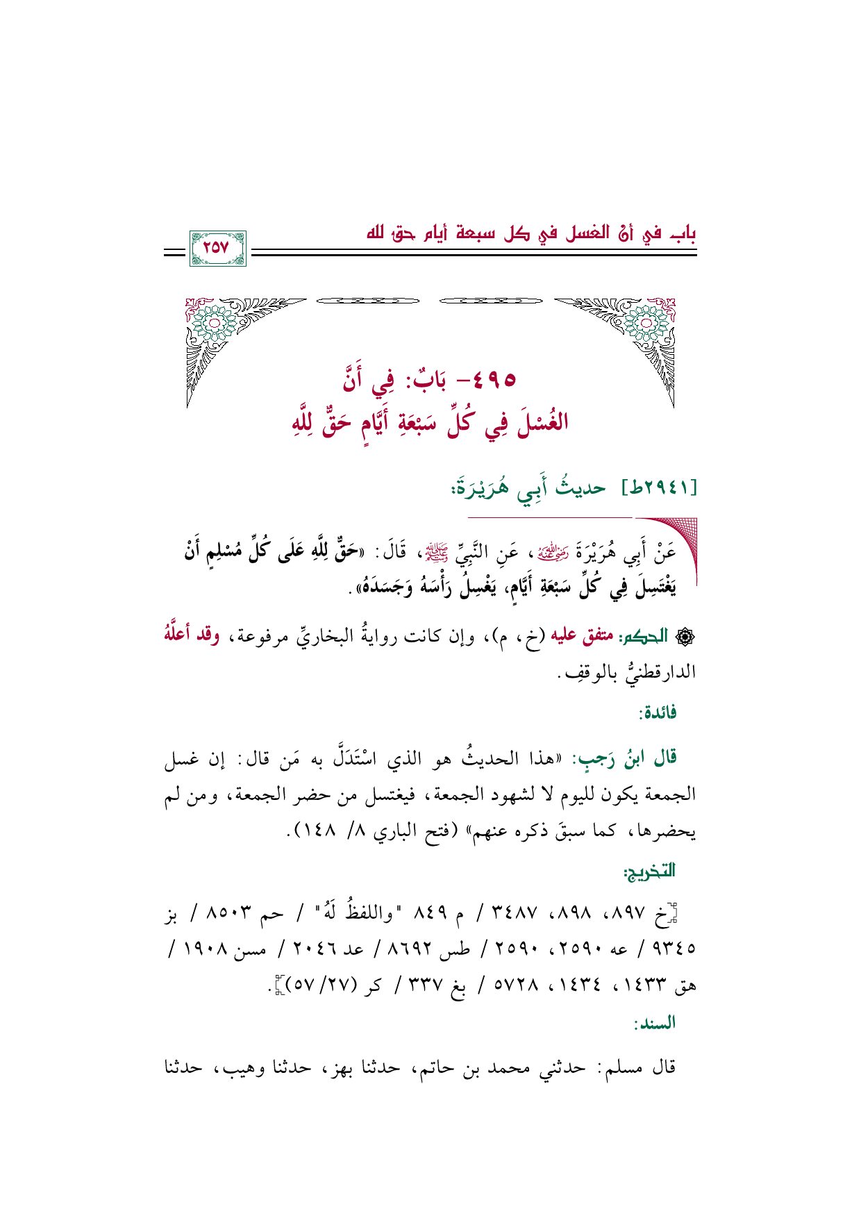قال ابنُ رَجبٍ: "هذا الحديثُ هو الذي اسْتَدَلَّ به مَن قال: إن غسل الجمعة يكون لليوم لا لشهود الجمعة، فيغتسل من حضر الجمعة، ومن لم يحضرها، كما سبقَ ذكره عنهم" (فتح الباري ٨/ ١٤٨).