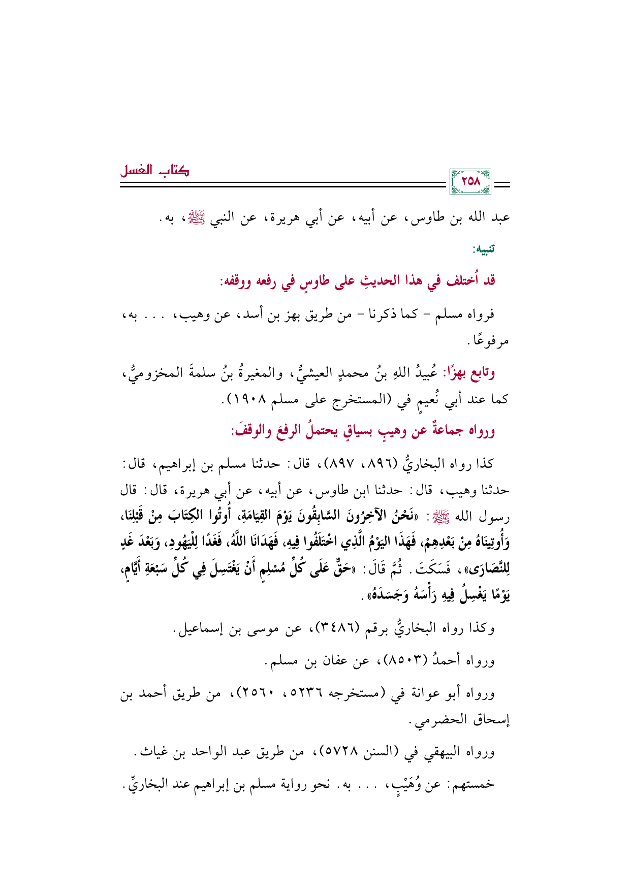 كذا رواه البخاريُّ (٨٩٦، ٨٩٧)، قال: حدثنا مسلم بن إبراهيم، قال: حدثنا وهيب، قال: حدثنا ابن طاوس، عن أبيه، عن أبي هريرة، قال: قال رسول الله صلى الله عليه وسلم: ((نَحْنُ الآخِرُونَ السَّابِقُونَ يَوْمَ القِيَامَةِ، أُوتُوا الكِتَابَ مِنْ قَبْلِنَا، وَأُوتِينَاهُ مِنْ بَعْدِهِمْ، فَهَذَا اليَوْمُ الَّذِي اخْتَلَفُوا فِيهِ، فَهَدَانَا اللَّهُ، فَغَدًا لِلْيَهُودِ، وَبَعْدَ غَدٍ لِلنَّصَارَى))، فَسَكَتَ. ثُمَّ قَالَ: ((حَقٌّ عَلَى كُلِّ مُسْلِمٍ أَنْ يَغْتَسِلَ فِي كُلِّ سَبْعَةِ أَيَّامٍ، يَوْمًا يَغْسِلُ فِيهِ رَأْسَهُ وَجَسَدَهُ)).